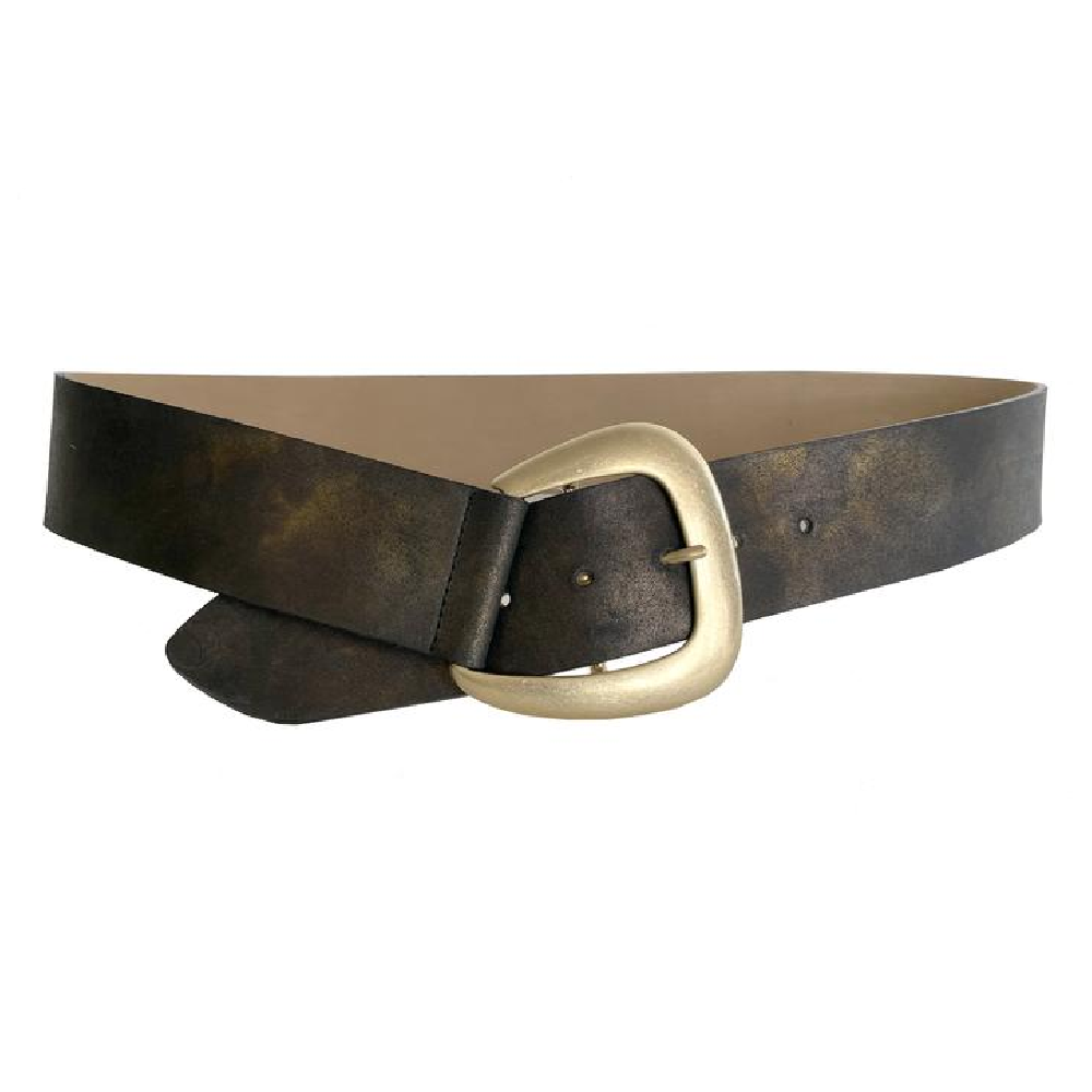Our novelty navy bronze mixed leather with a shimmer finish on a light gold plated drop waist buckle.