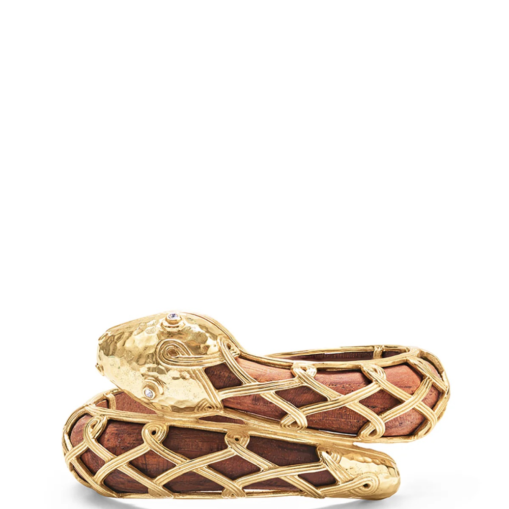 Sleek and exotic, this elegant garden creature is a symbol of flexibility and quick wit. Hand-carved teak wood is festooned delicately with hand-applied golden lattice so intricate, one of our artisans can only make two pieces in a day. This whimsical piece adds a fierce layer of smile-inducing sophistication to your ensemble.