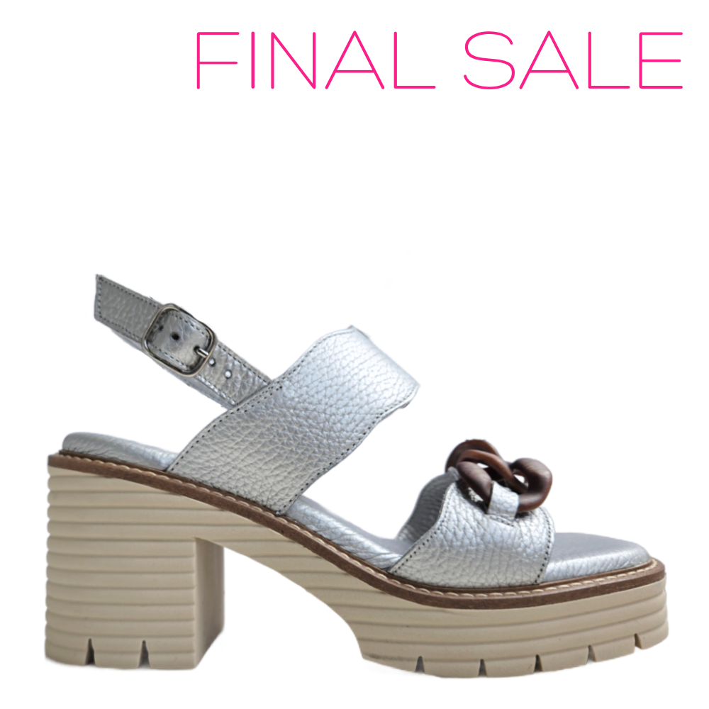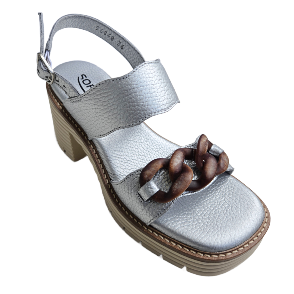 A striking mix of shine and texture, this Softwaves platform heel stuns in silver metallic leather with eye-catching brown resin chain links