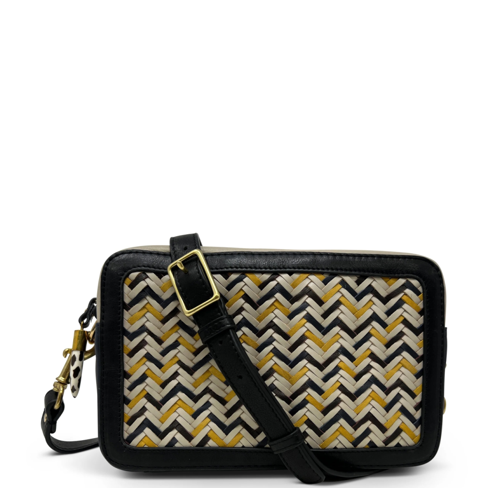 As we dive into the summer season, Kempton & Co. presents a bold and colorful update to the Amberleigh, making it a true showstopper. This iconic silhouette, inspired by vintage travel and classic camera bags, has been reimagined with vibrant, summer-ready details. The Amberleigh now features a striking woven geometric design on one side panel in chalk, black, and yellow leather, while the top showcases a complementary woven pattern in chalk, yellow, black, and pink leather. The sides are crafted from rich navy leather, adding a sophisticated touch, and the back pocket is finished in sleek black leather for a classic contrast.