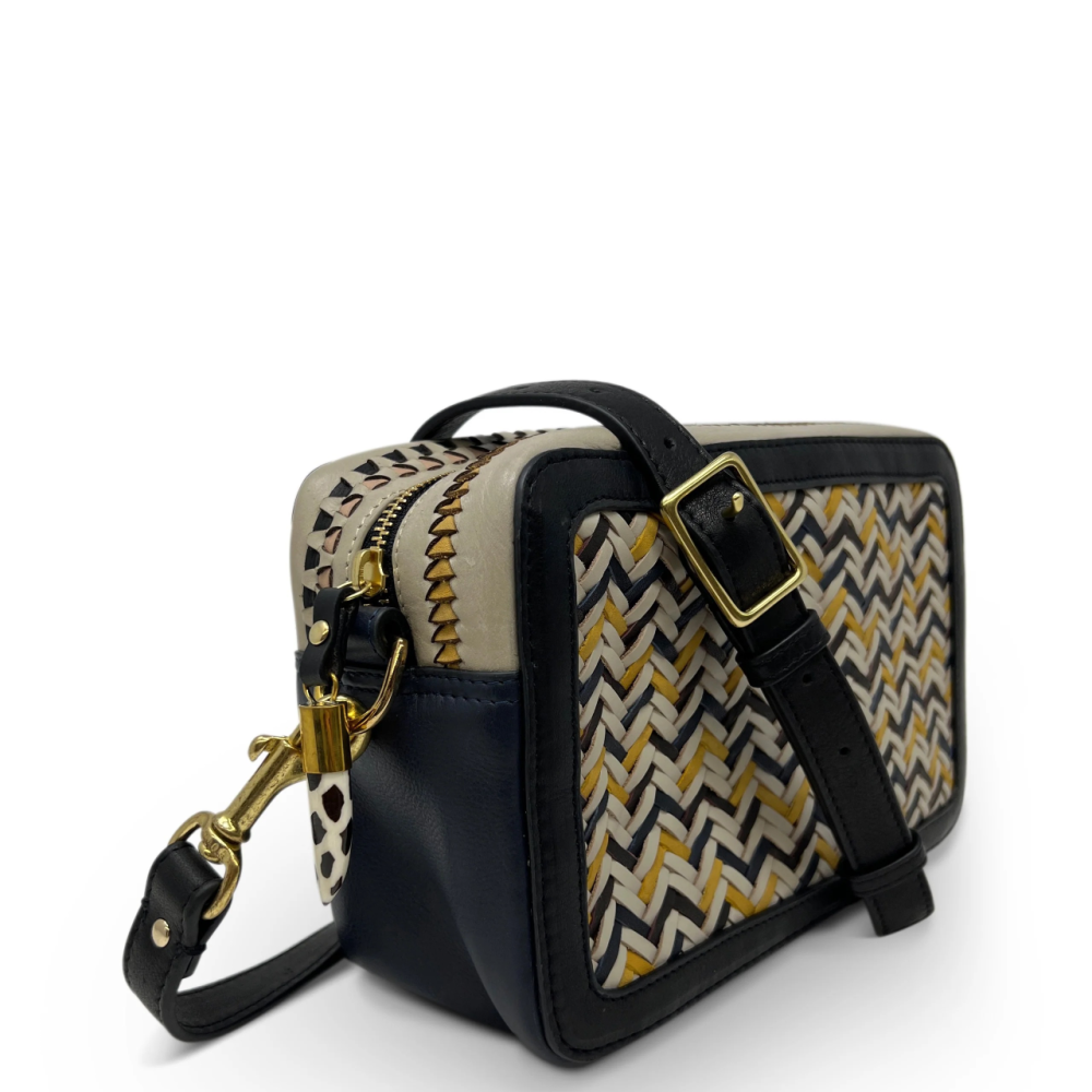 Compact yet spacious, the Amberleigh is thoughtfully designed to keep your essentials—documents, valuables, wallet, and phone—secure and easily accessible, whether you're on a summer adventure or enjoying an evening out. When a more polished look is in order, simply remove the strap and carry it as an elegant clutch. The dynamic interplay of woven patterns with the deep navy and black leather elements ensures that this bag stands out, effortlessly pairing with everything from laid-back summer outfits to more tailored pieces. The Amberleigh is your perfect companion for blending bold style with everyday functionality this summer.