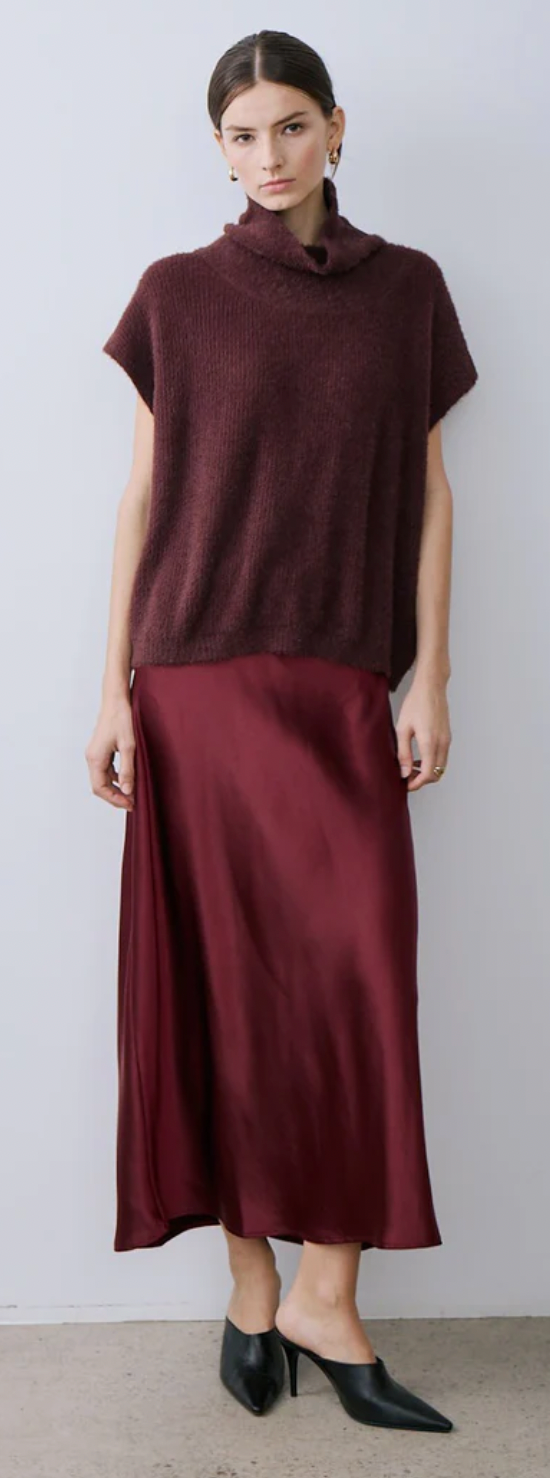 Effortlessly sophisticated with a modern edge, this Melissa Nepton satin midi skirt is a timeless wardrobe staple. Designed with a fluid silhouette and a rich burgundy sheen, it drapes beautifully for a flattering, feminine look. The sleek, minimalist cut makes it easy to dress up or down - perfect for everything from office days to evening dinners.