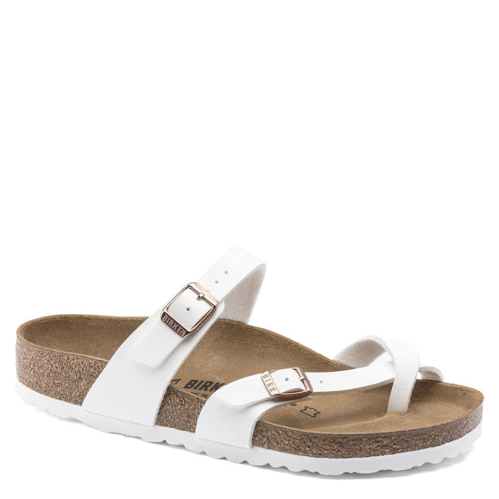 The Mayari from BIRKENSTOCK - an elegantly comfortable sandal with adjustable, crisscrossing straps that form a single loop around the toe. Classic support and adjustability, designed beautifully. Shown in white Birko-Flor® with tone on tone outsole and copper tone buckles.