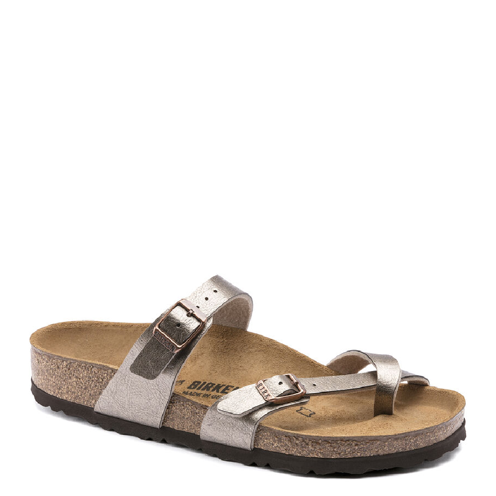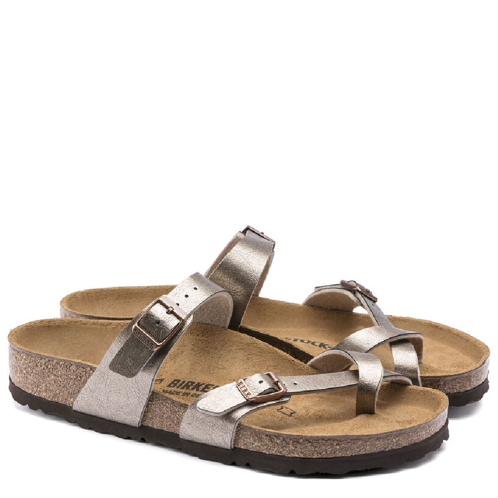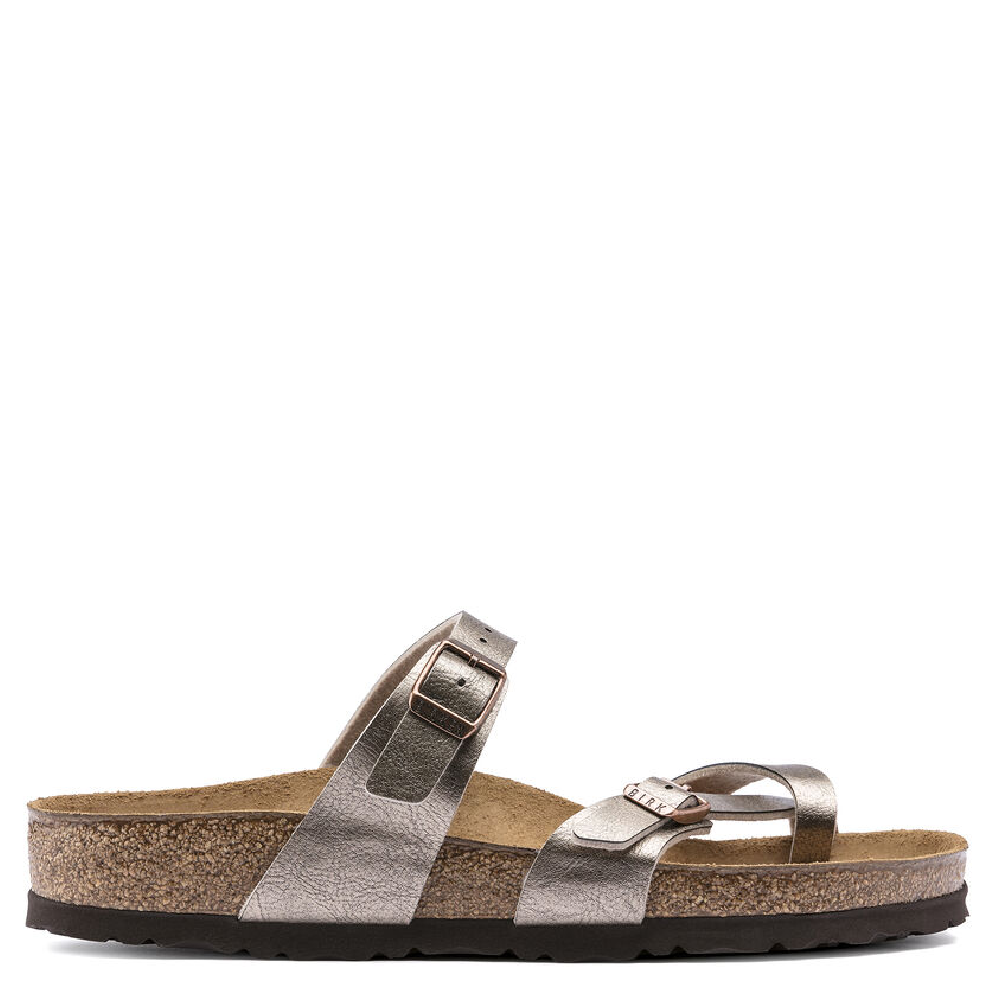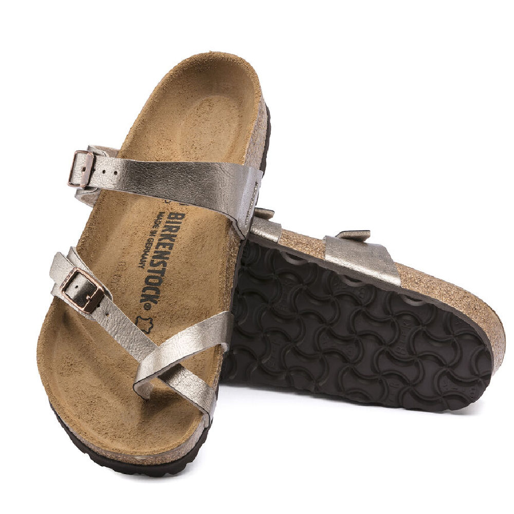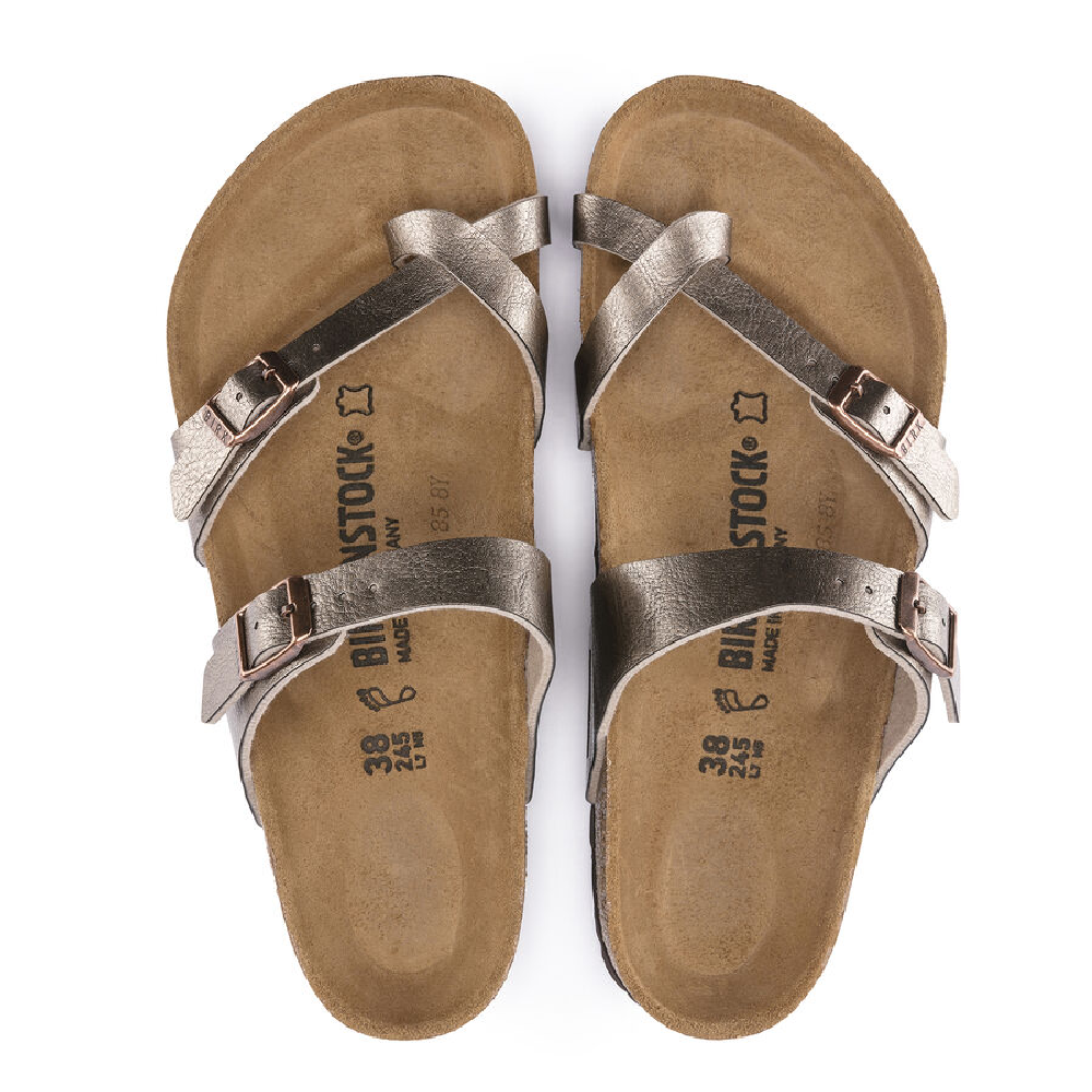 The Mayari from BIRKENSTOCK is an elegantly comfortable sandal with adjustable, crisscrossing straps that form a single loop around the toe. Classic support and adjustability, designed beautifully. This version features a subtle, frosted effect. The upper is made from the skin-friendly, hard-wearing synthetic material Birko-Flor®.