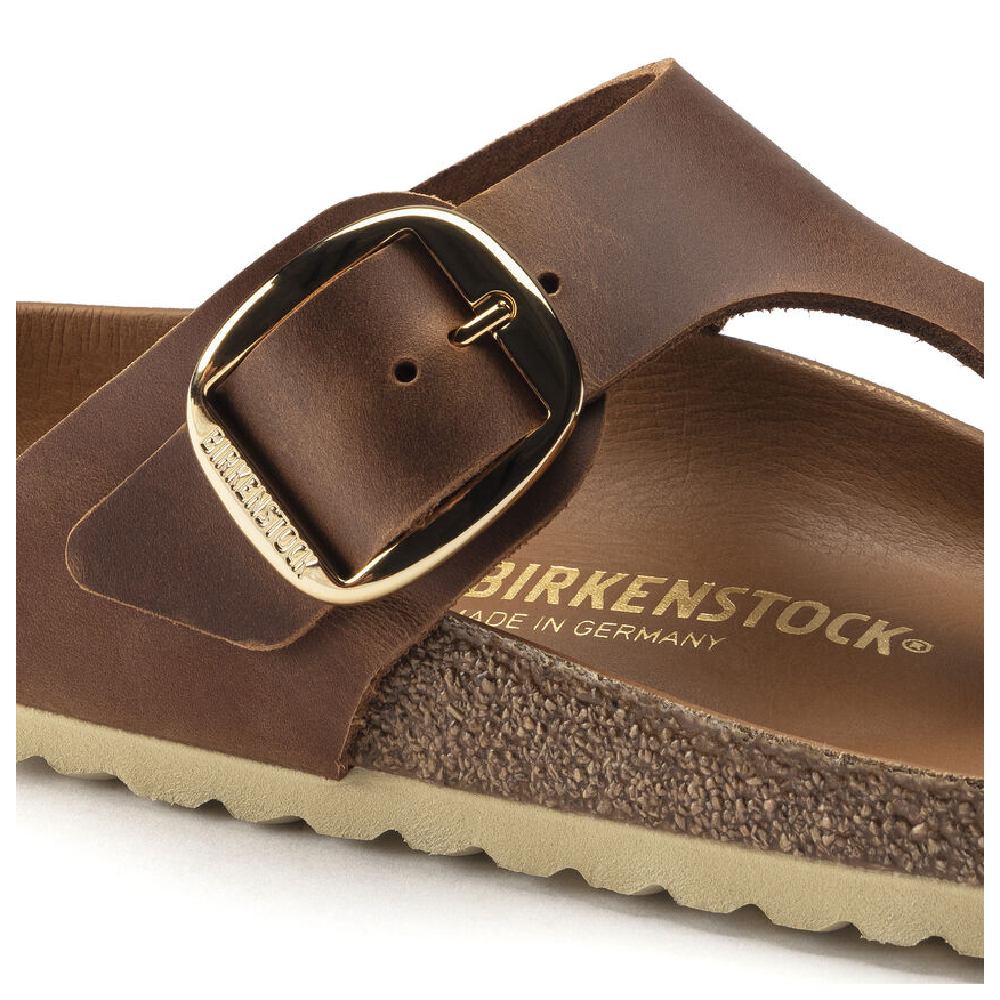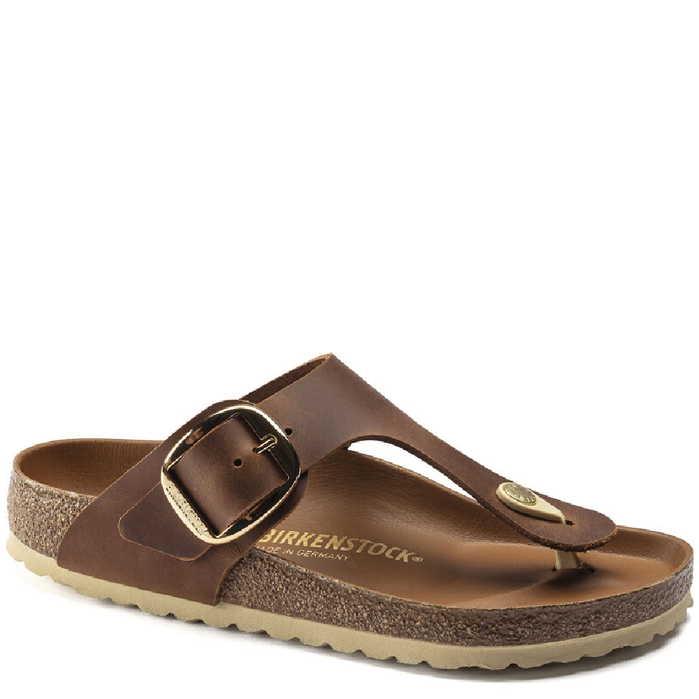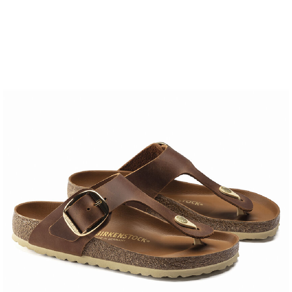 Meet the brand new Gizeh Big Buckle. This classic thong sandal gets a fresh update with an elegant amplified buckle. This feminine style that's comfortable and easy to wear. The lining of the footbed is covered with soft smooth leather and matches the shoe in color. The upper is made from extra-thick, oiled nubuck leather and features an open-selvage finish.- Anatomically shaped cork-latex footbed; semi-exquisite