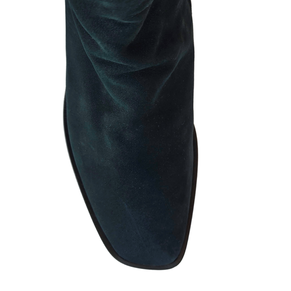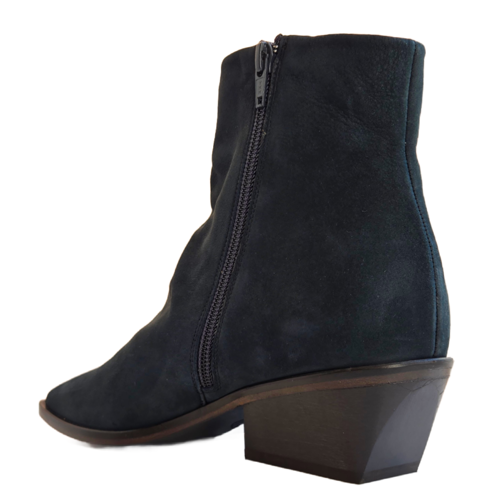 You will be hard-pressed to find a more versatile ankle bootie. With its sleek, minimalist design, the Wind Boot features an artfully angular toe and supremely walkable, recessed flared heel - you might detect slight notes of western influence. Crafted in a unique (and hard to capture in a photo) blue/green leather.