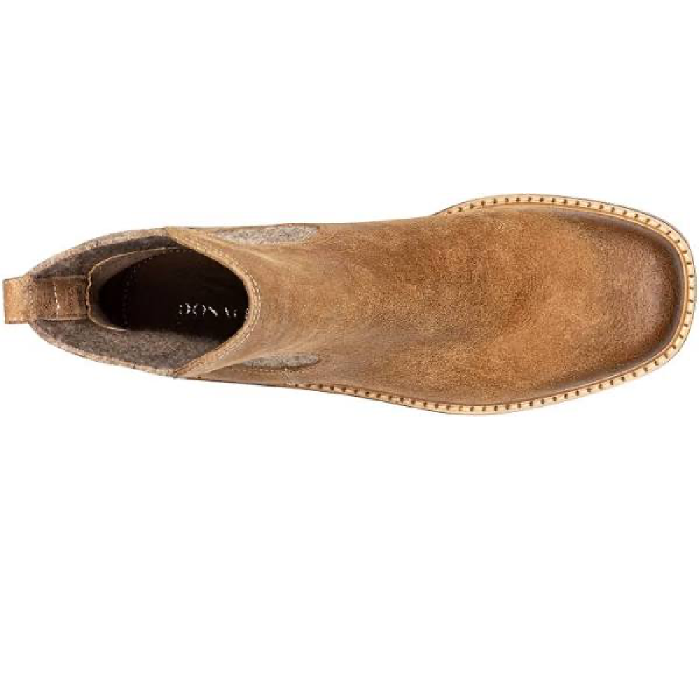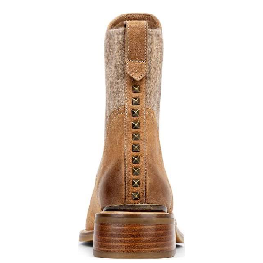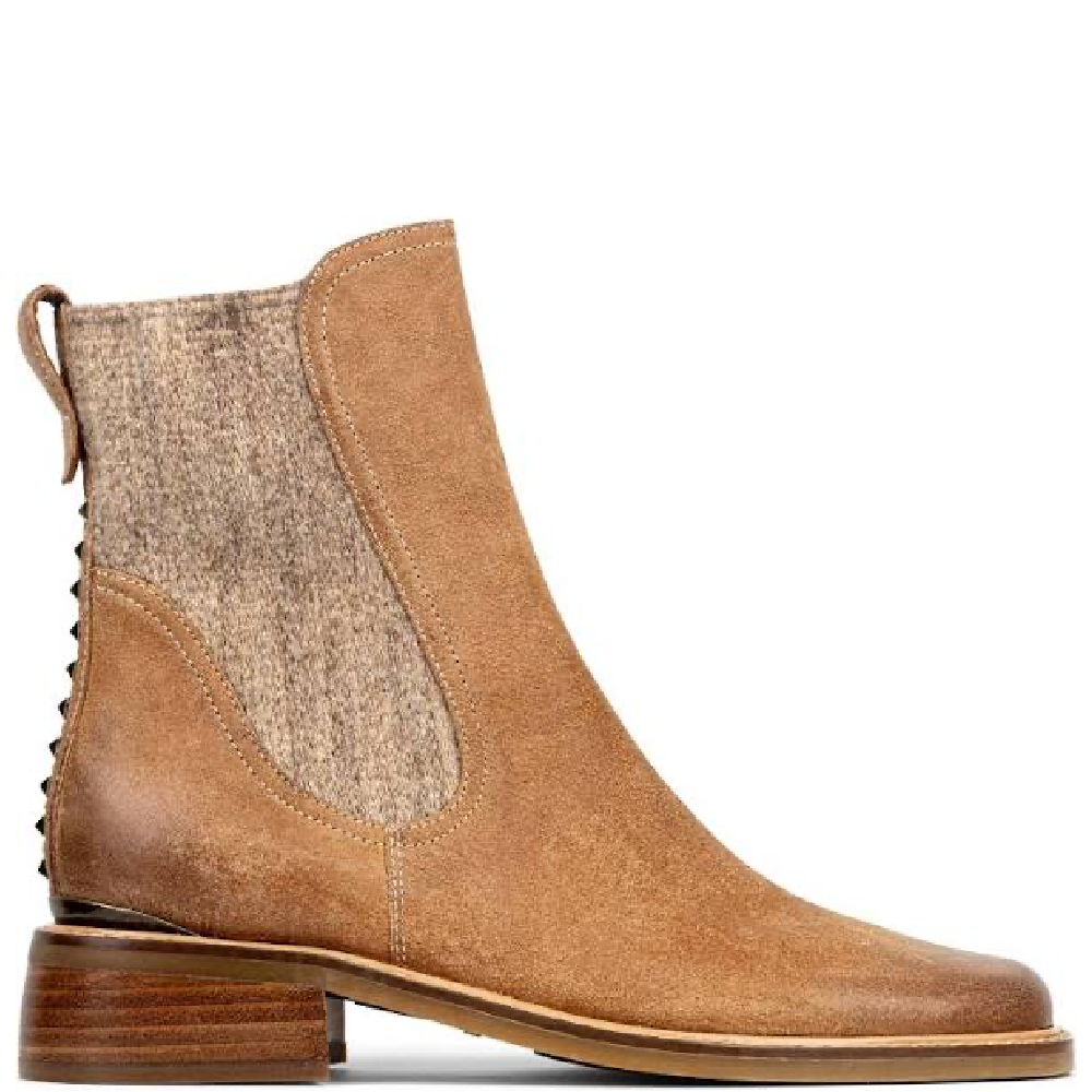 AUTUMN is here. This modern square-toe Chelsea bootie in reverse calf suede features a wrap-around elastic gore and back tab that make it easy to pull on and off. The back is also detailed with small metal pyramid studs and a metal rand, while a stacked leather heel gives the shoe a little height. Leather lining and a memory foam padded insole provide comfort. Finished with a molded rubber outsole for flexibility and added traction.