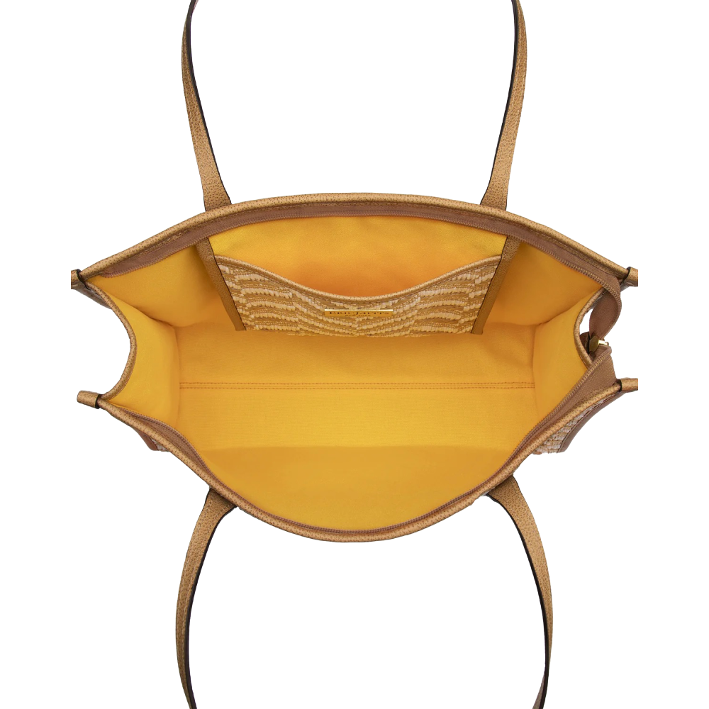 Inside: durable canvas lining and a hanging pocket of leather trimmed woven raffia.