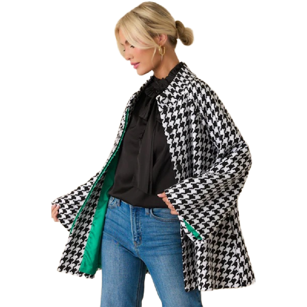 The Deveraux Car Coat is a masterclass in statement layering. Tailored in bold houndstooth with a contrast lining that peeks out with personality, it bridges the line between timeless and daring. Wear it open over denim or draped over your shoulders with a dress — either way, it's the piece that makes every exit feel like the end of a fashion film.