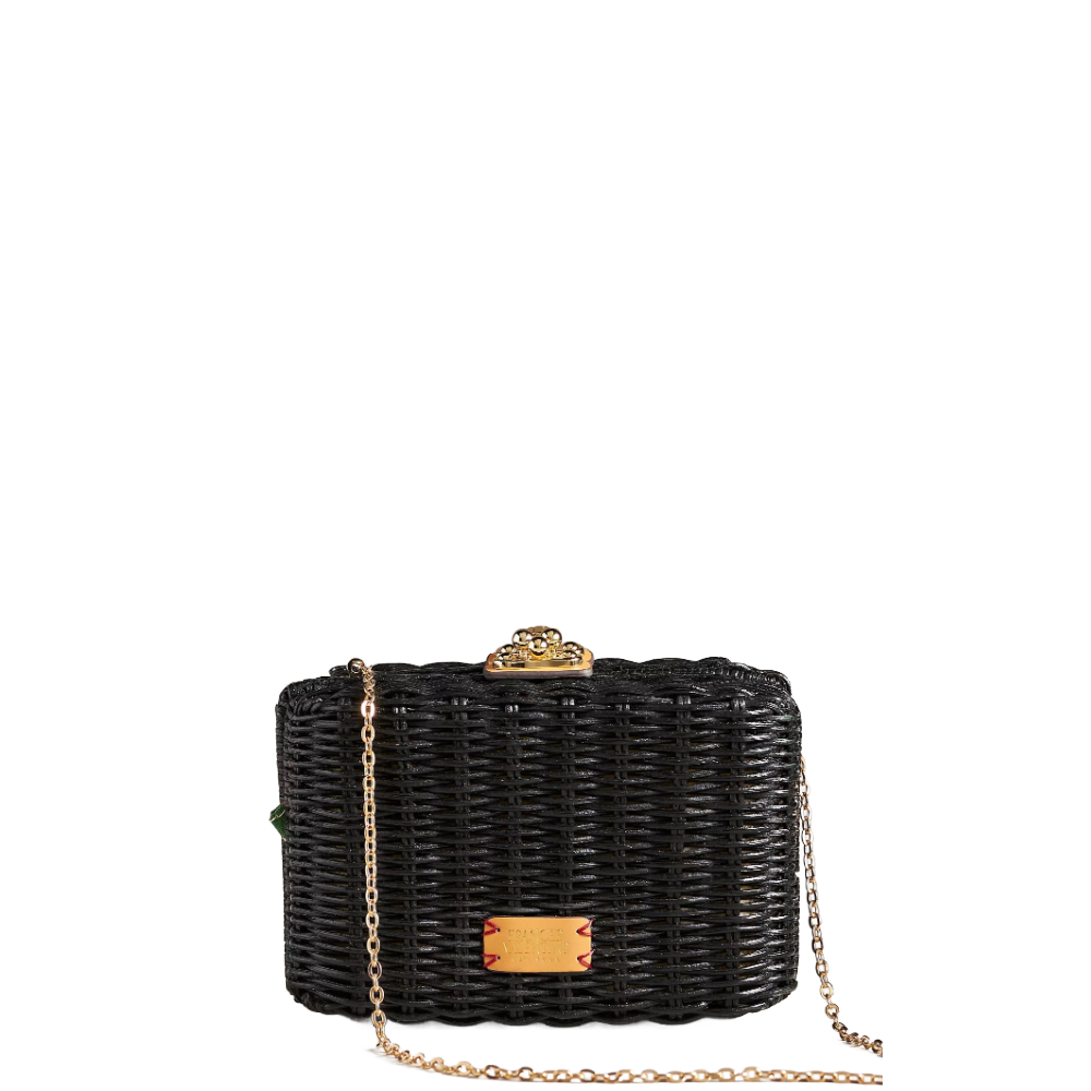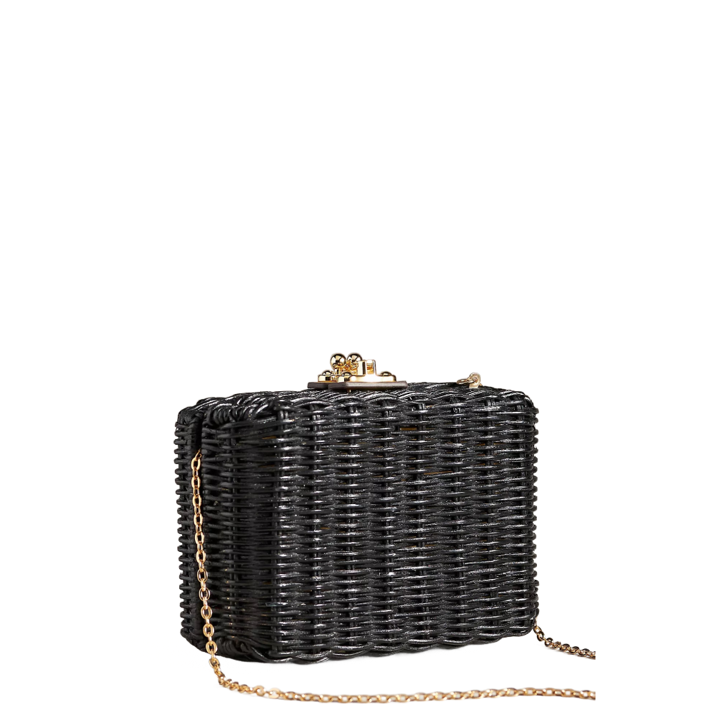 The Frances Valentine Paige Wicker Box Clutch is a versatile, compact bag that can be worn as a crossbody or carried with the chain strap tucked away.