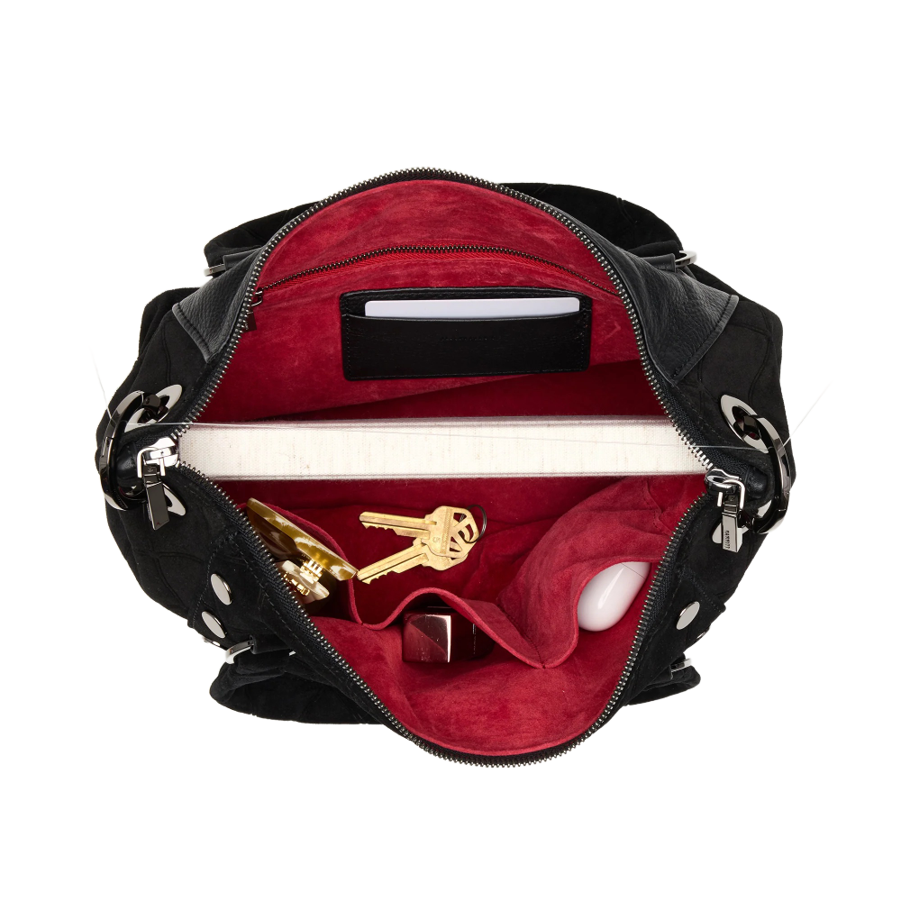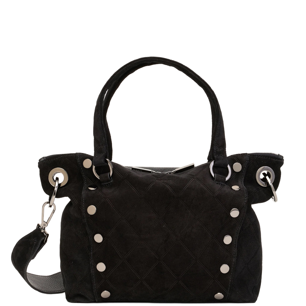 - Crafted with a deep black Italian suede with a unique doubled diamond embossing effect and black pebble leather accents