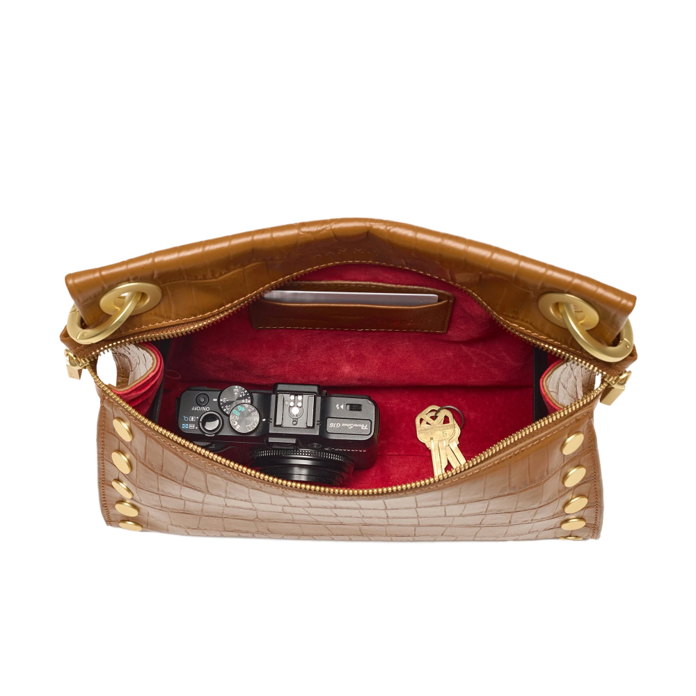 With an adjustable strap, easy-to-access cellphone pocket and single zippered compartment, the Tony makes a perfect introduction to our world of functionality and fashion. Now, this special drop also features larger-than-life details, with an oversized logo, oversized zipper, and vintage-inspired strap, with rivets from end to end. Inspired by the striated textures of canyon walls, Canyon Crocco showcases soft, full-grain Italian leather with a tumbled crocco embossing in a rich, warm brown. Darker accents along the embossed edges add depth and a natural, authentic finish. Paired with Canyon Pebble, a warm mid tone brown with a smooth pebbled texture, this duo captures rugged elegance with timeless appeal.