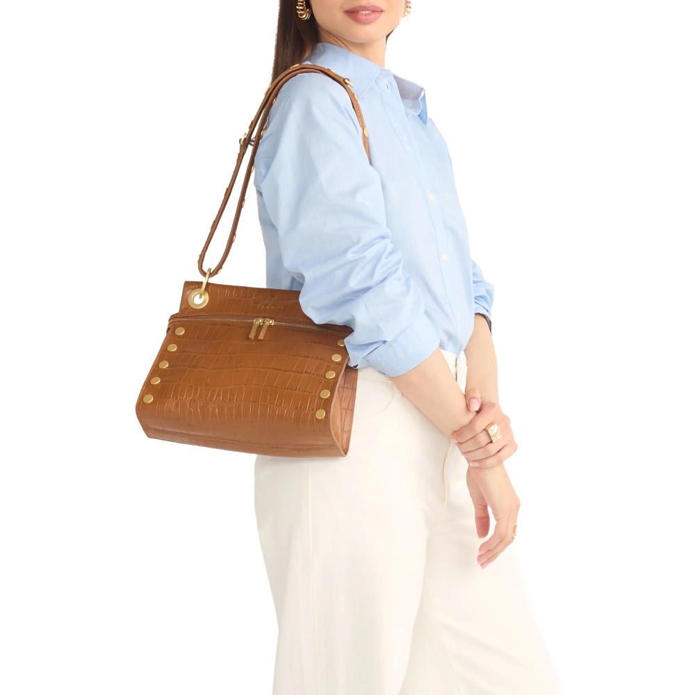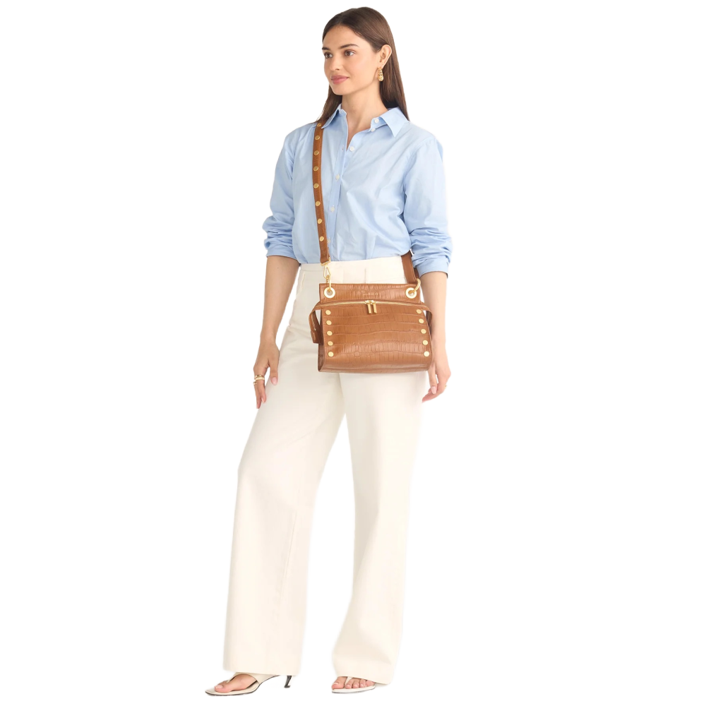 - Riveted shoulder strap can be worn as a crossbody or shoulder strap