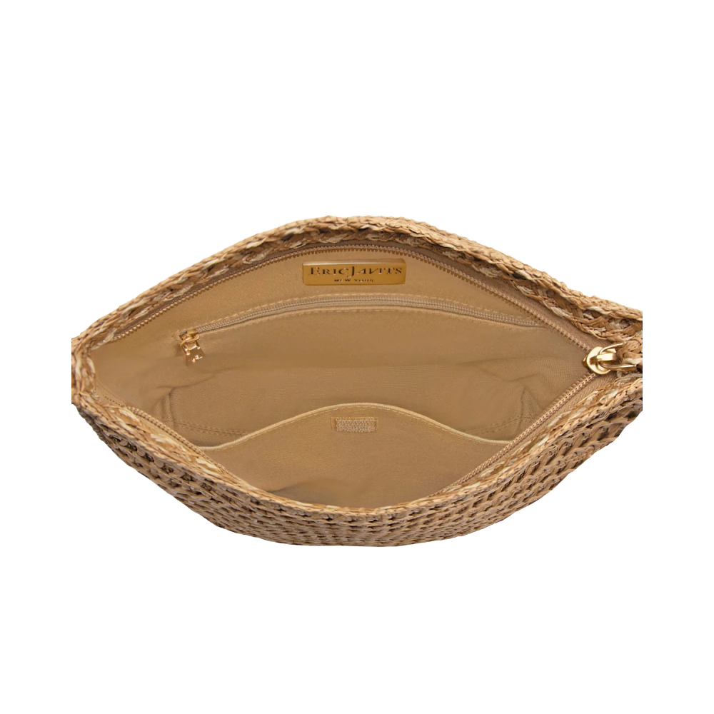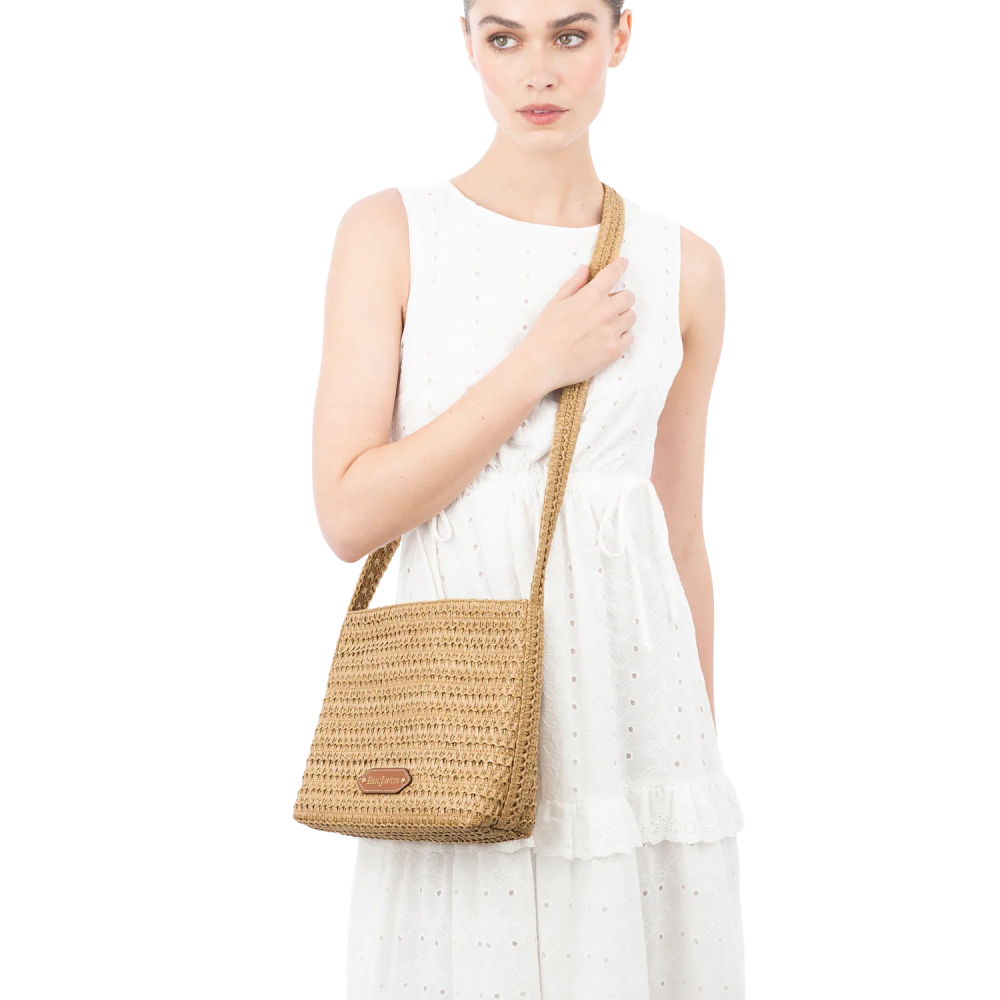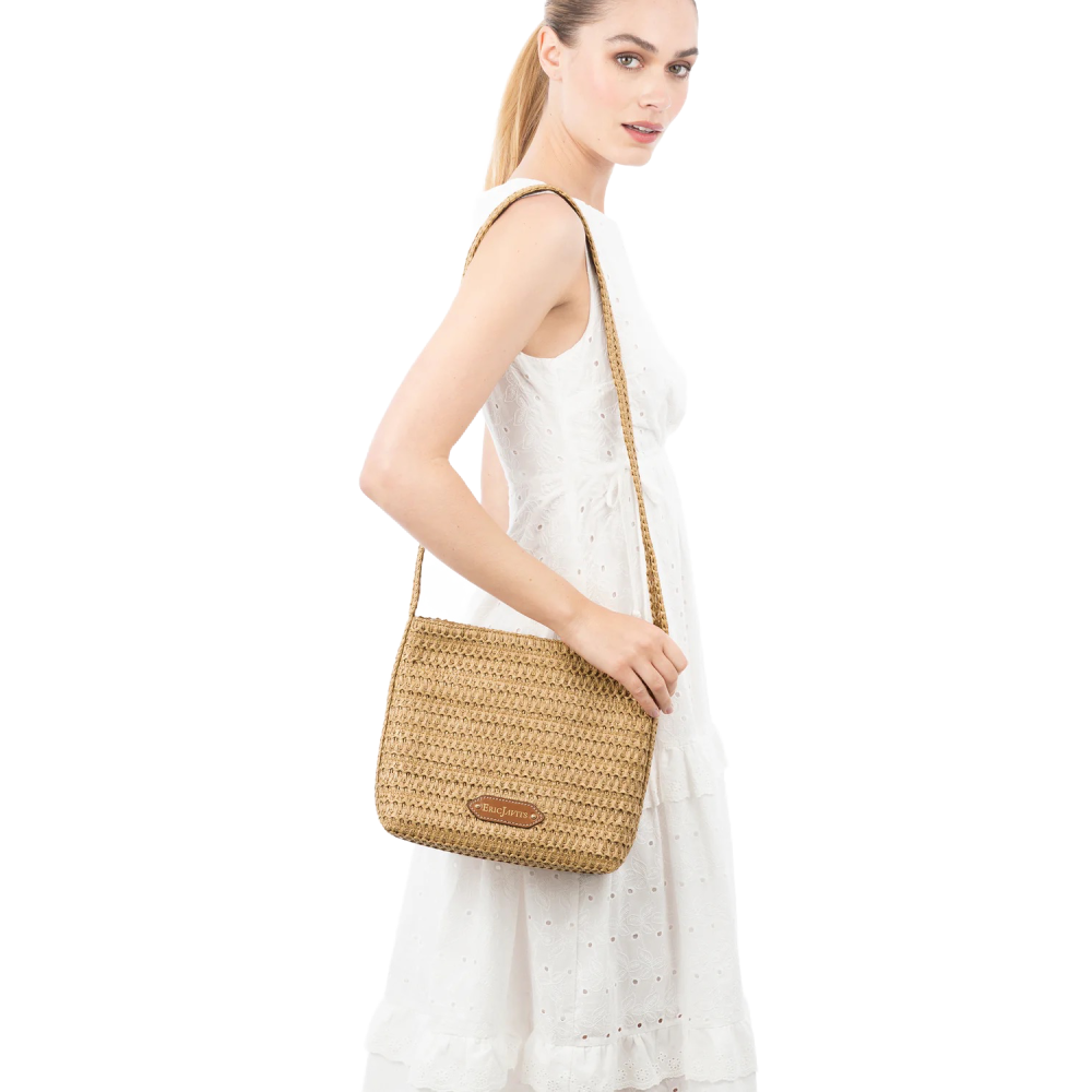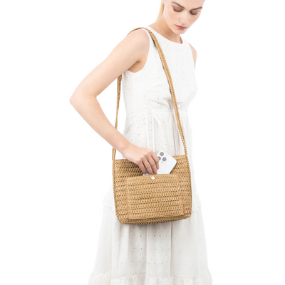 A women's designer crossbody bag for sale online of woven raffia with top zipper closure is super cute for use throughout spring-summer months.
