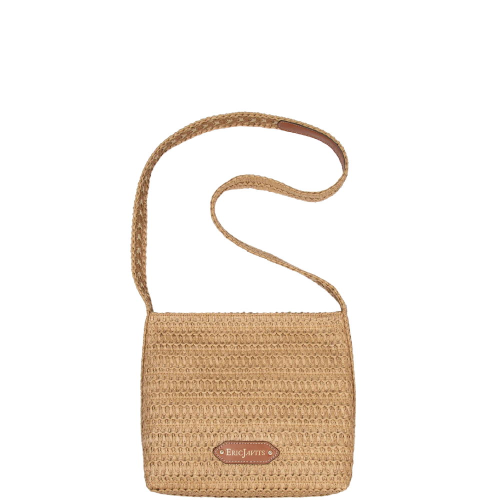 The textured weave is intricate with its long strap extending down the sides of the bag body. The mid-size rectangular shape is soft and squishy and feels body friendly. A roomy outer pocket on reverse is for easy access to phone or glasses.