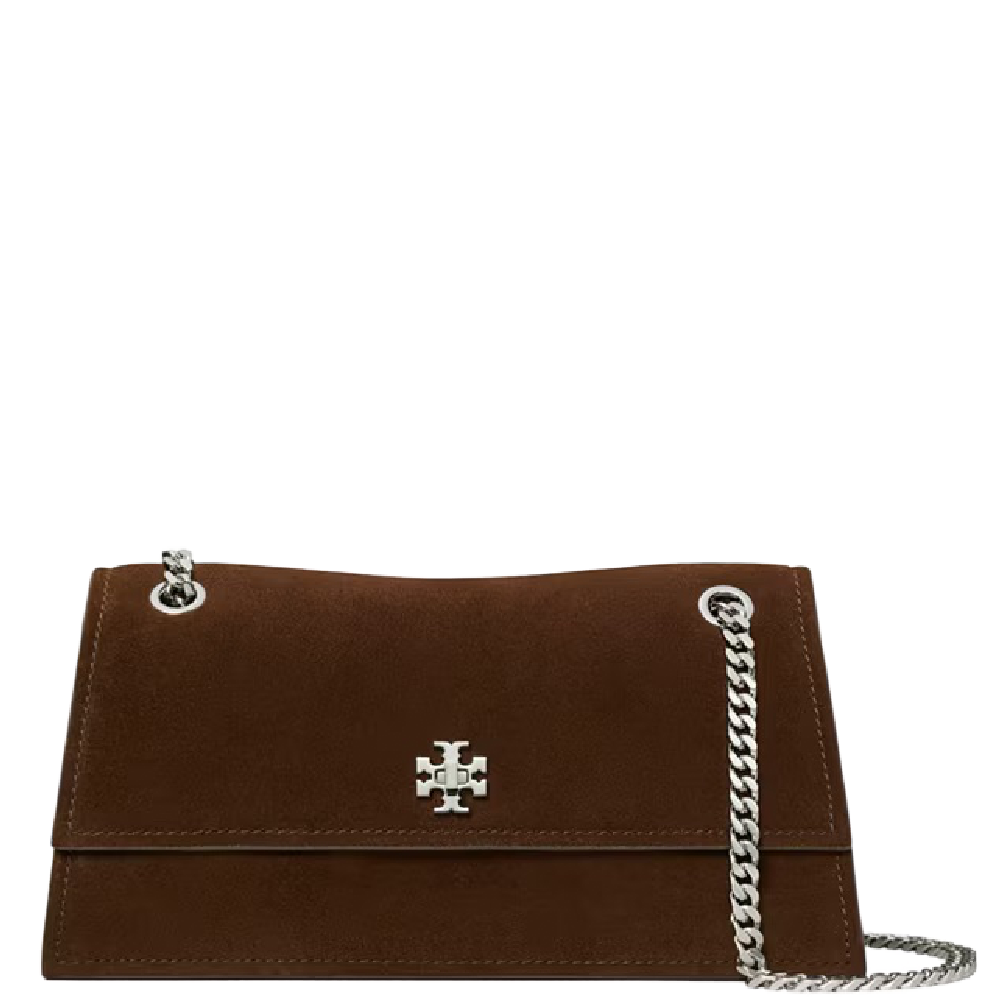 Introducing the Kira Turnlock shoulder bag. Sharp angles with graphic hardware: a chunky curb chain strap and a turnlock closure. The classic flap silhouette is crafted in soft suede and opens to three compartments that expand and contract for optimal organization.