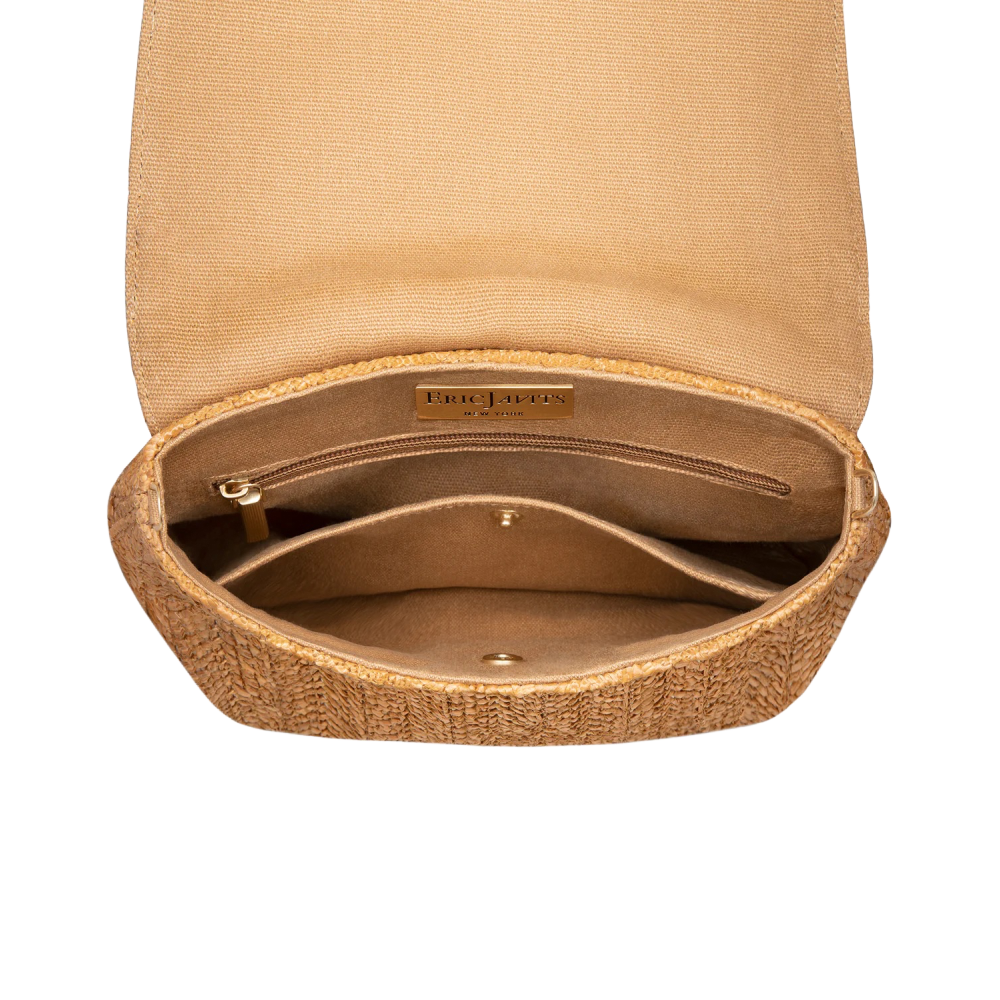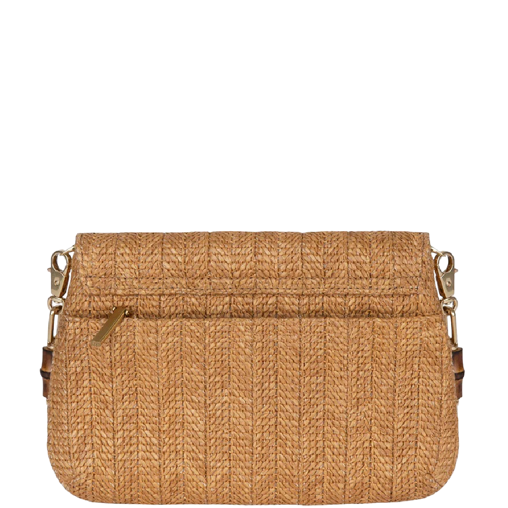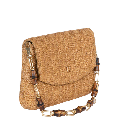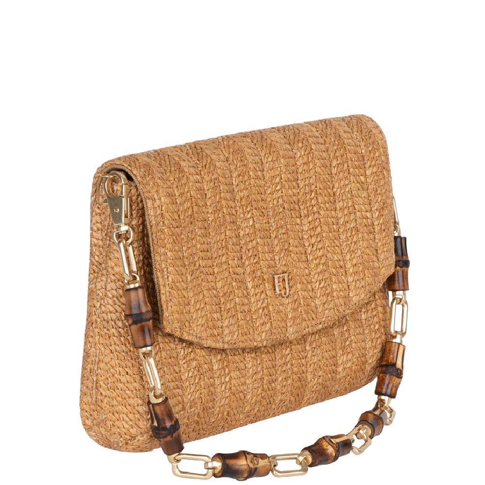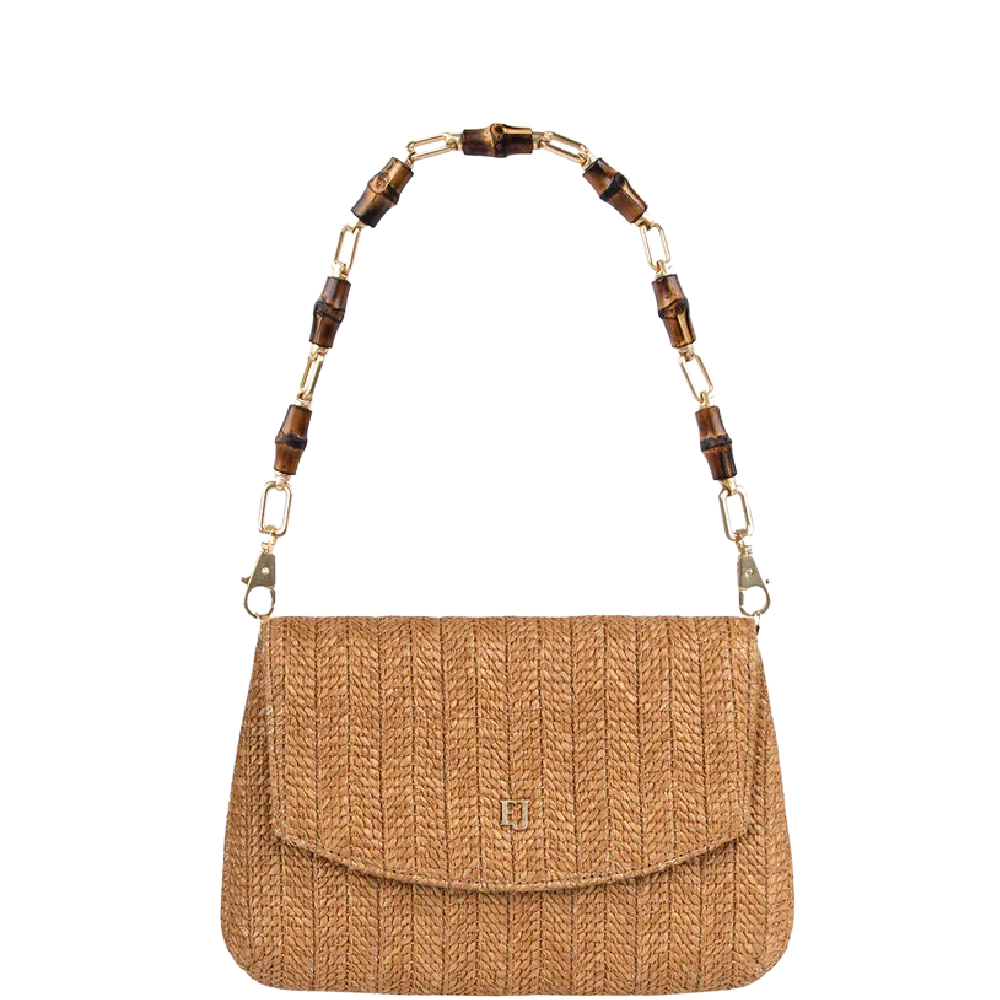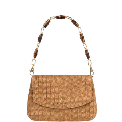 A small raffia straw women’s clutch for sale online with a detachable bamboo chain handle that screams summer!