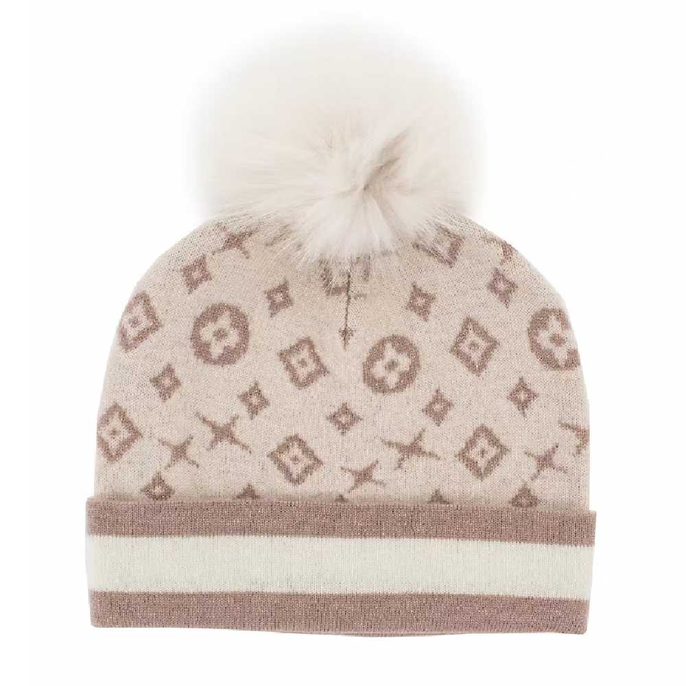 DUSTY PINK KNIT LUREX HAT WITH MONOGRAM PATTERN & CONTRAST CUFF WITH FOX FUR POMPOM