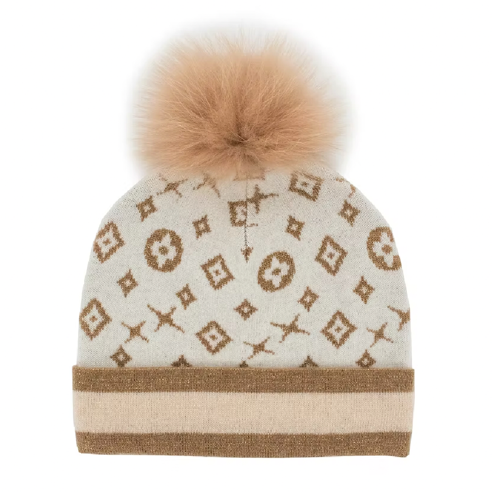 GOLD KNIT LUREX HAT WITH MONOGRAM PATTERN & CONTRAST CUFF