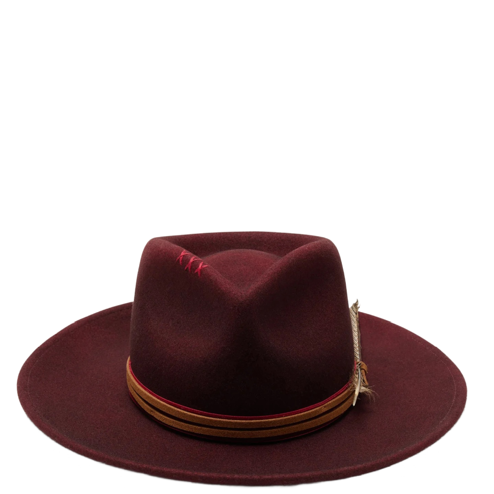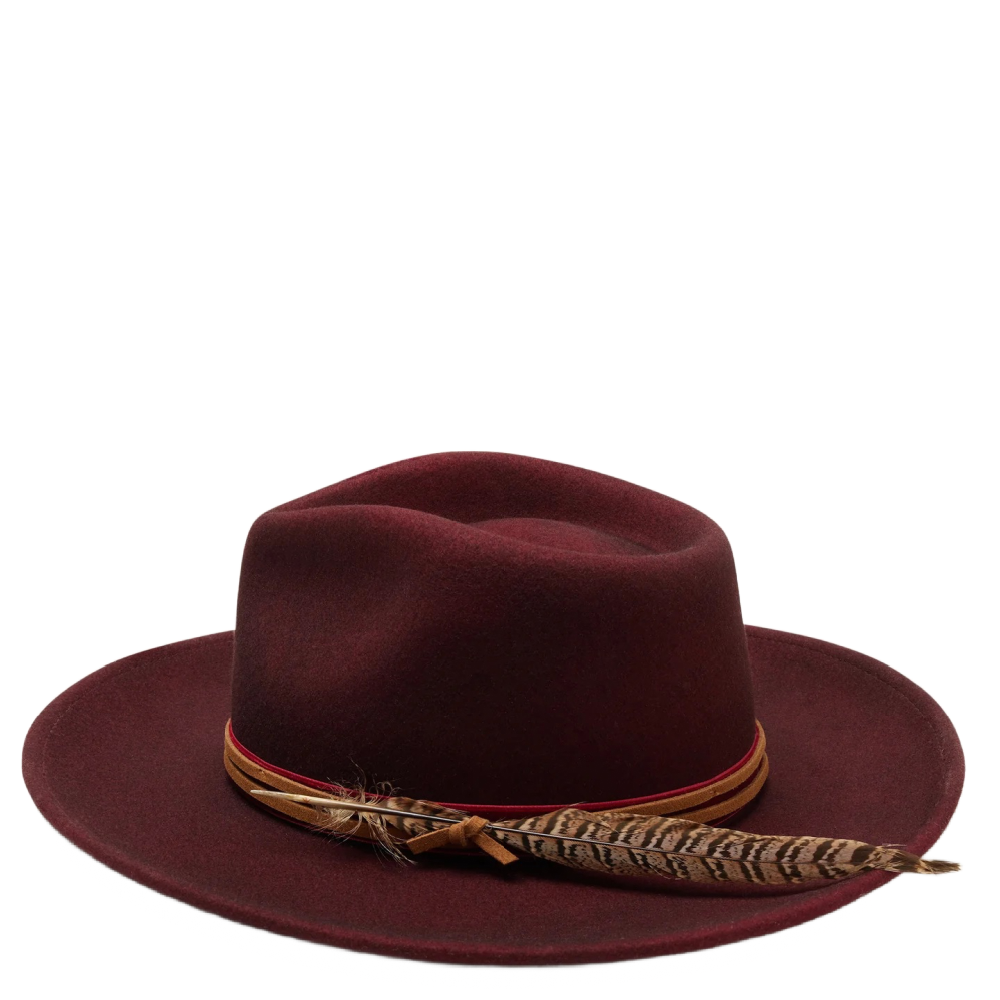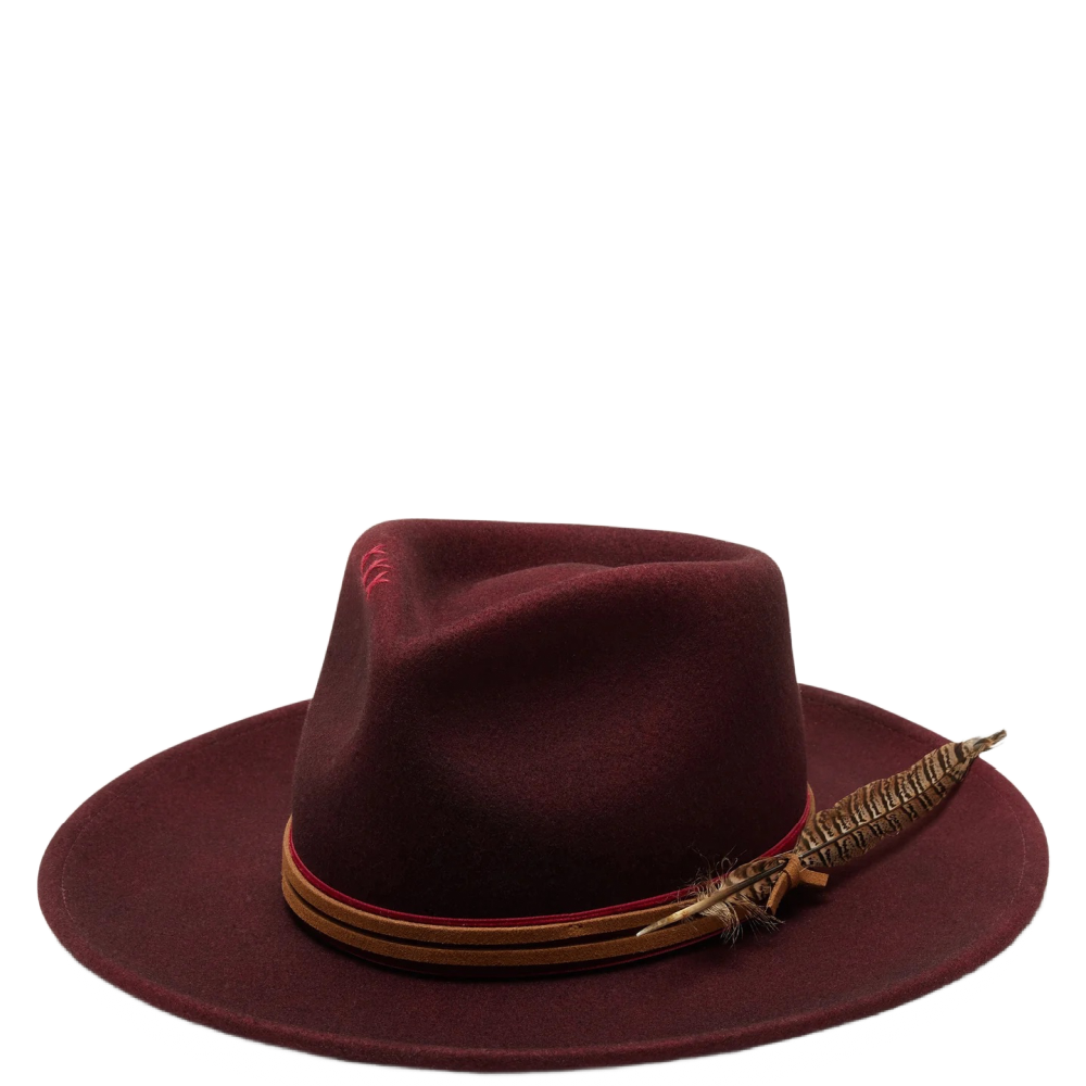 Jared is the boho hat of our dreams. Made with 100% Australian wool felt, it's construction includes a stiff upturned brim, teardrop crown with hand-stitched detail, and leather, velvet, and feather trim.