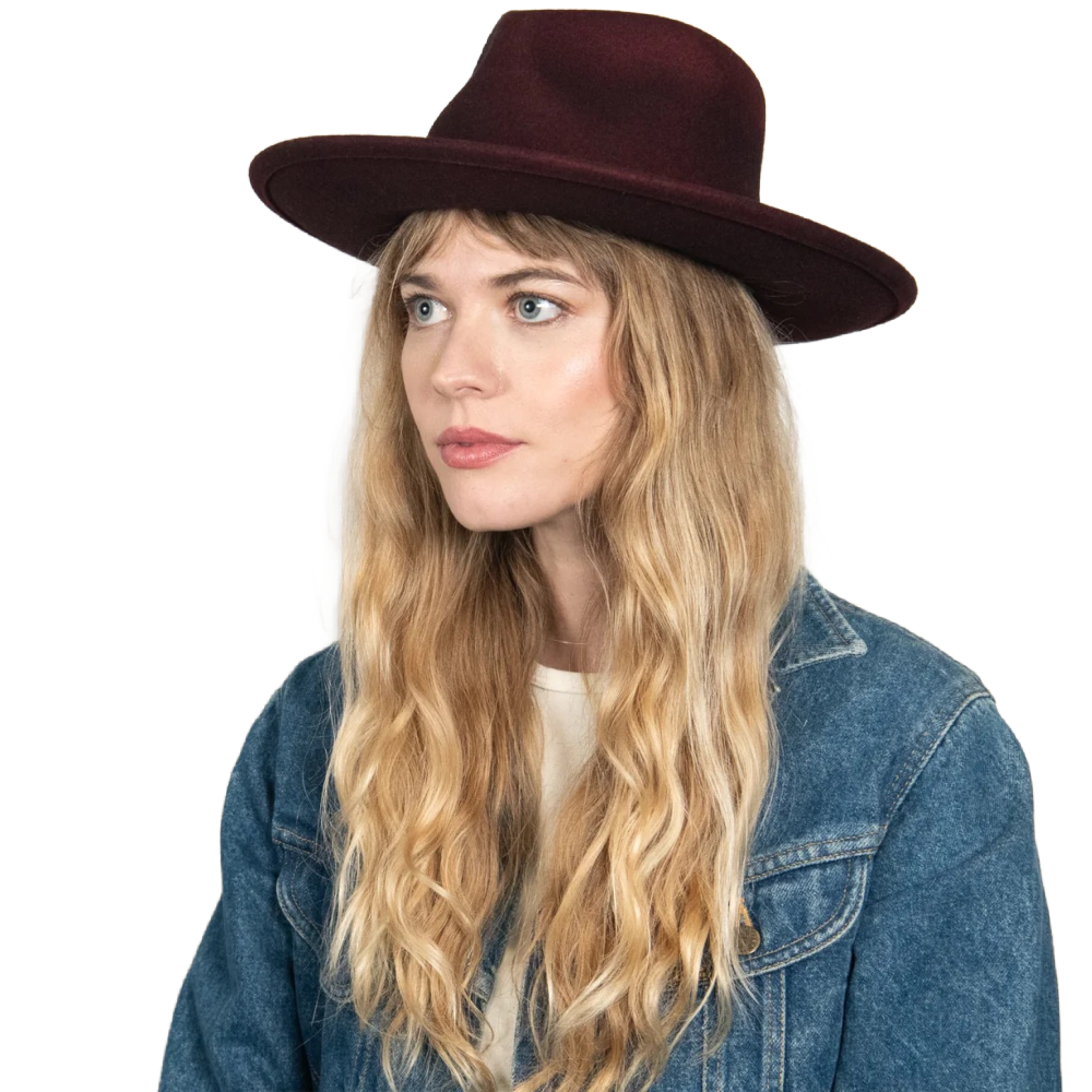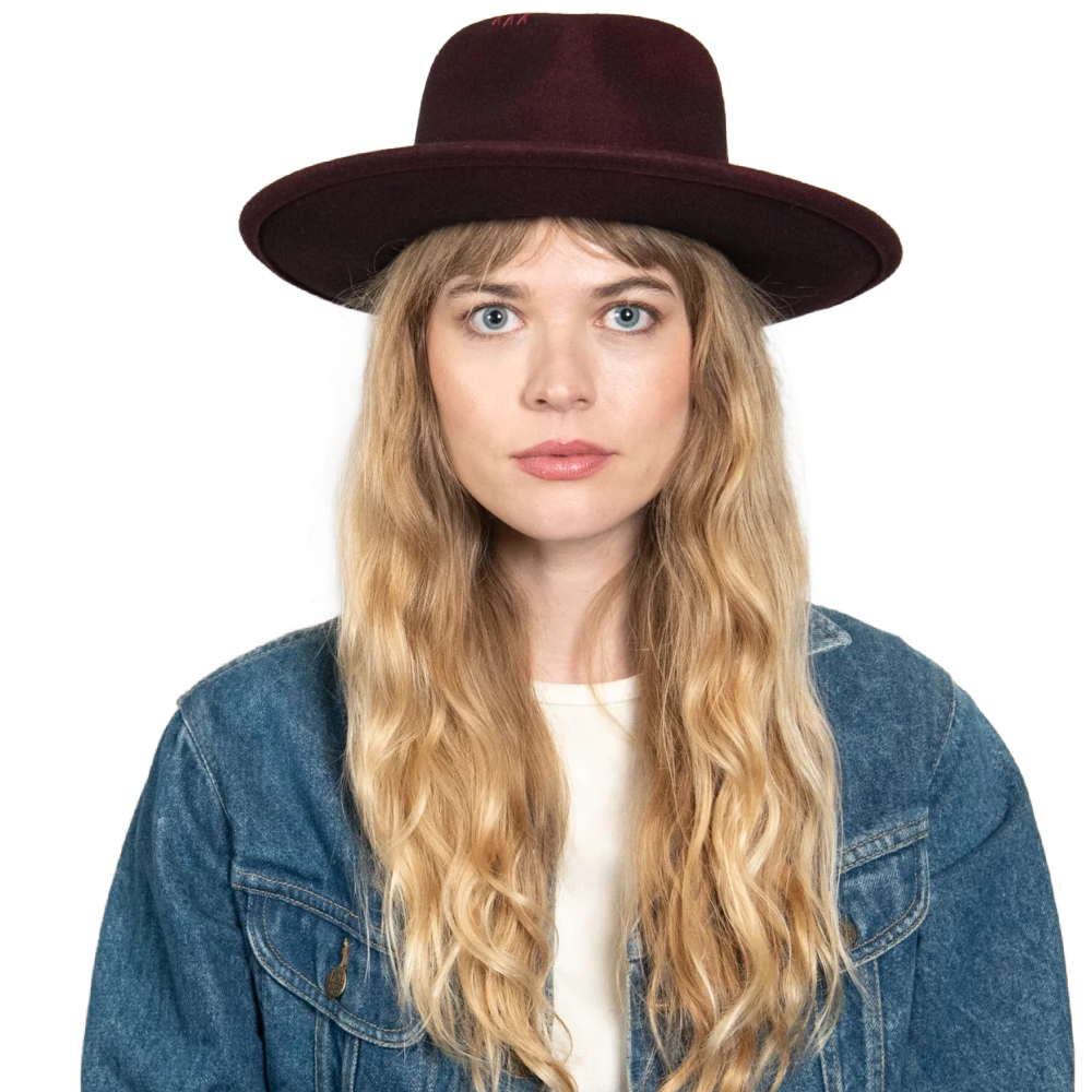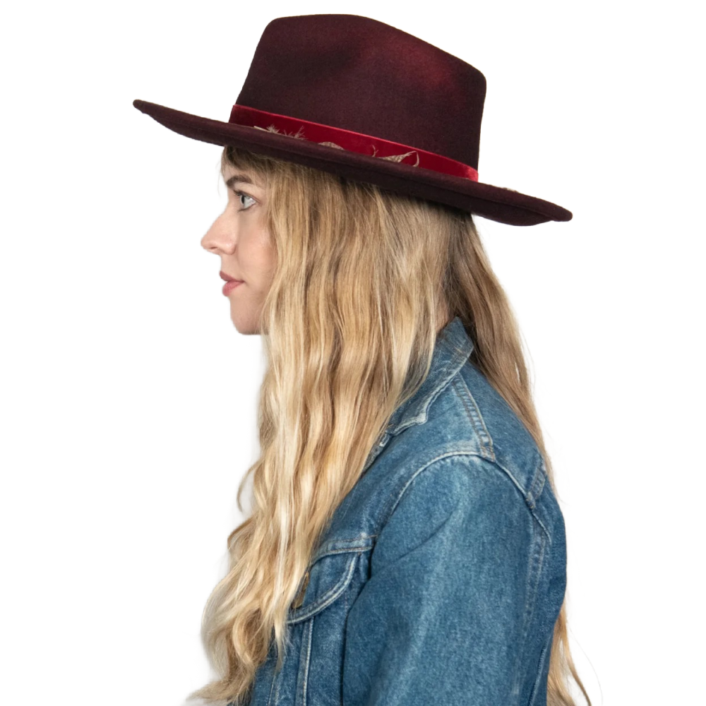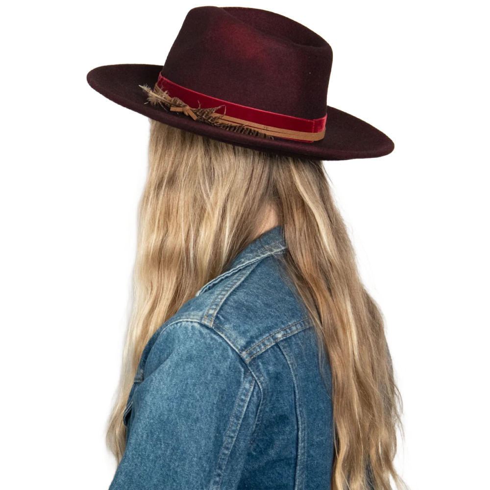 Jared is the boho hat of our dreams. Made with 100% Australian wool felt, it's construction includes a stiff upturned brim, teardrop crown with hand-stitched detail, and leather, velvet, and feather trim.