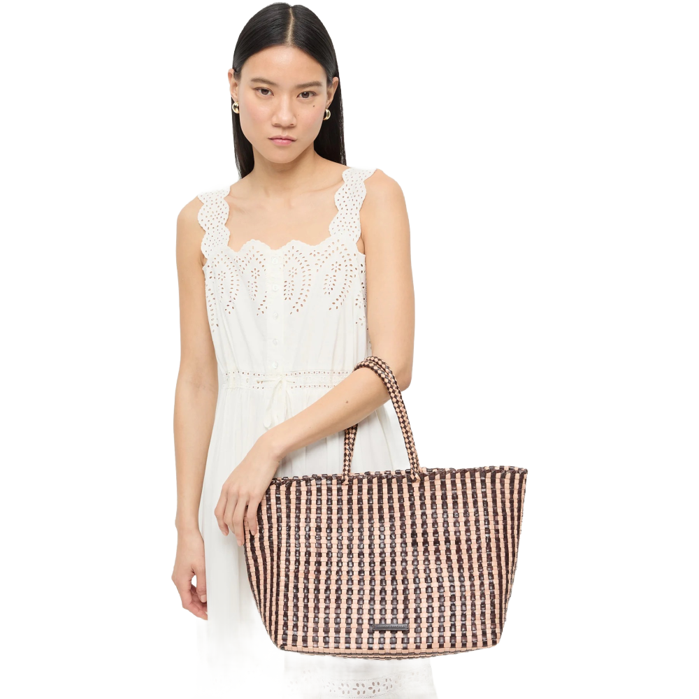 Tote in desert sand and chocolate brown woven leather. Features shoulder straps and an exterior leather stamped logo.