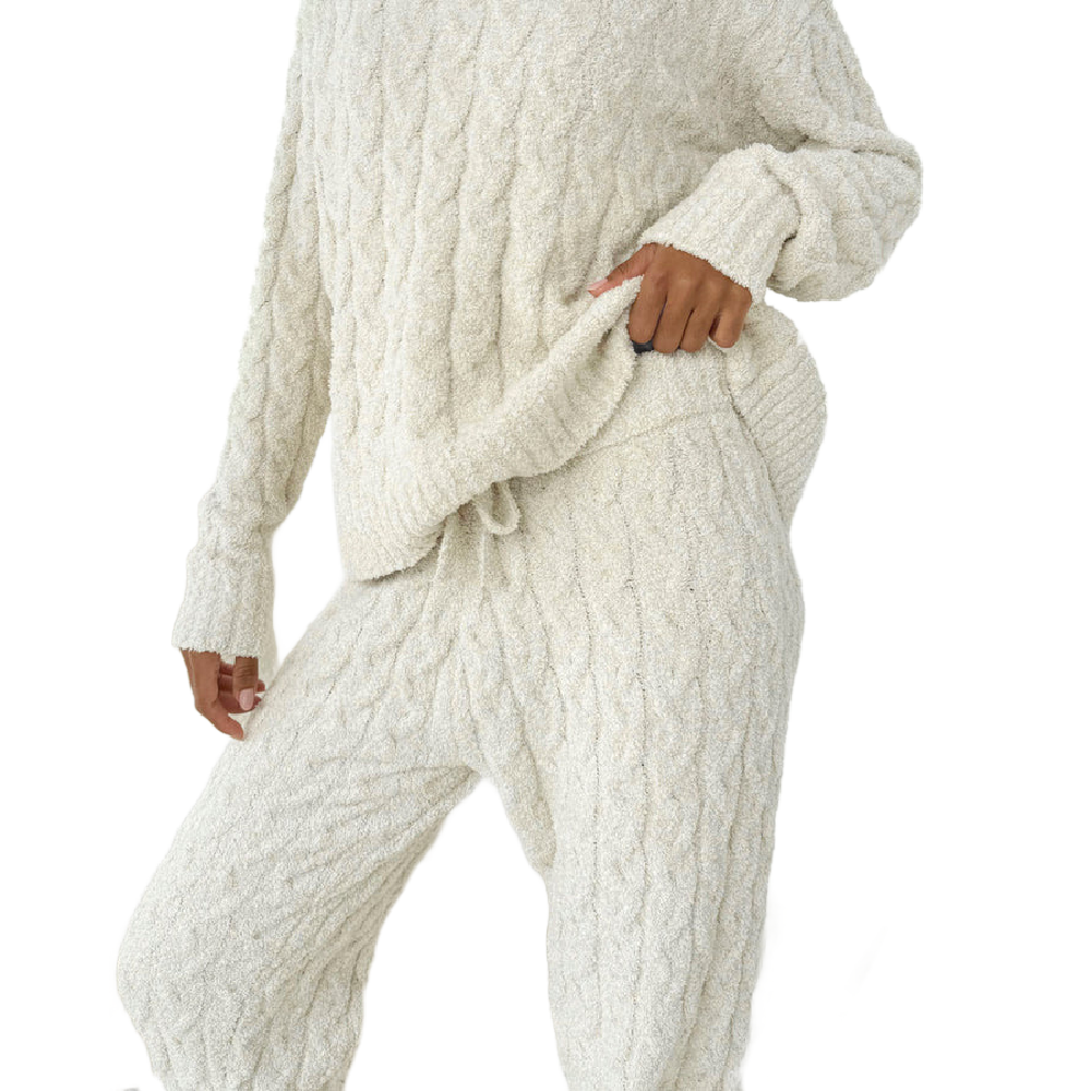 With a charming cable pattern, this plush pullover and jogger set is just as polished as it is cozy.