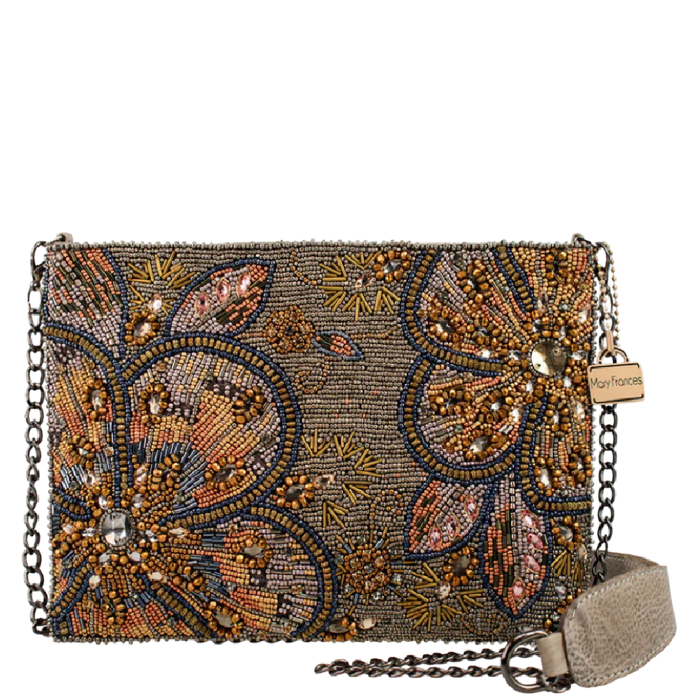 Turn heads with this radiant beaded crossbody purse, where warm metallic hues and sparkling gems bloom into a dazzling floral design. In a versatile neutral palette that pairs effortlessly with almost anything, it’s perfect for elevating your daytime look or adding shimmer after dark. Your new go-to for effortless, refined glam.