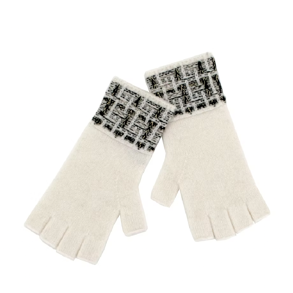 IVORY MIX TWEED KNITTED FINGERLESS GLOVES 100% WOOL