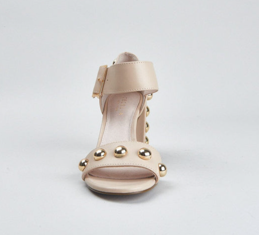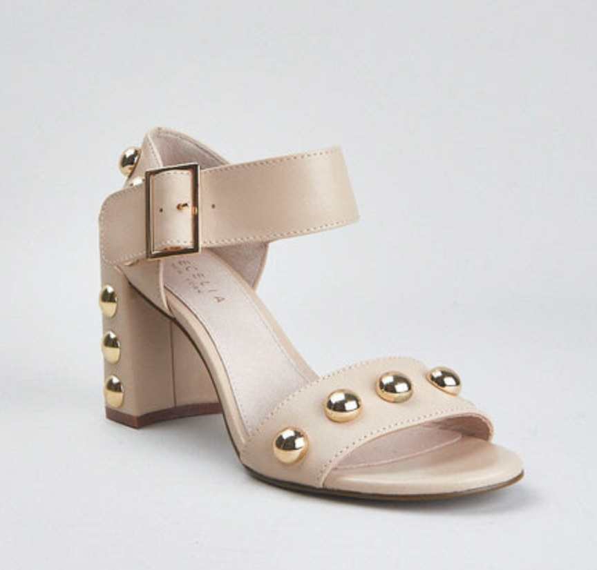 Supersized studs inspired by Roman palace architecture are a bold statement on this block heel of this ankle-strap leather sandal.