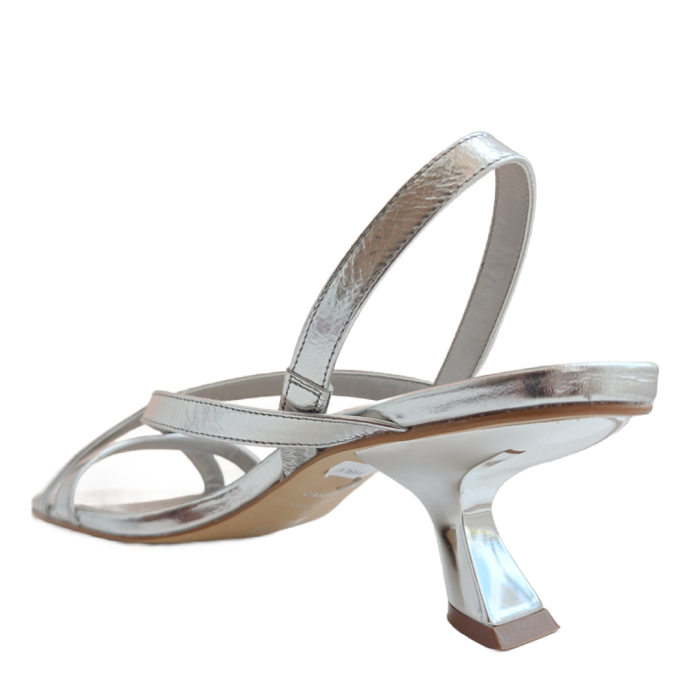 Step into sleek sophistication with this heeled strappy sandal in gleaming metallic leather. The modern, angular heel adds an architectural edge, while the delicate straps wrap the foot in just the right amount of shine. It's the perfect blend of minimal and bold—ready to elevate any outfit.