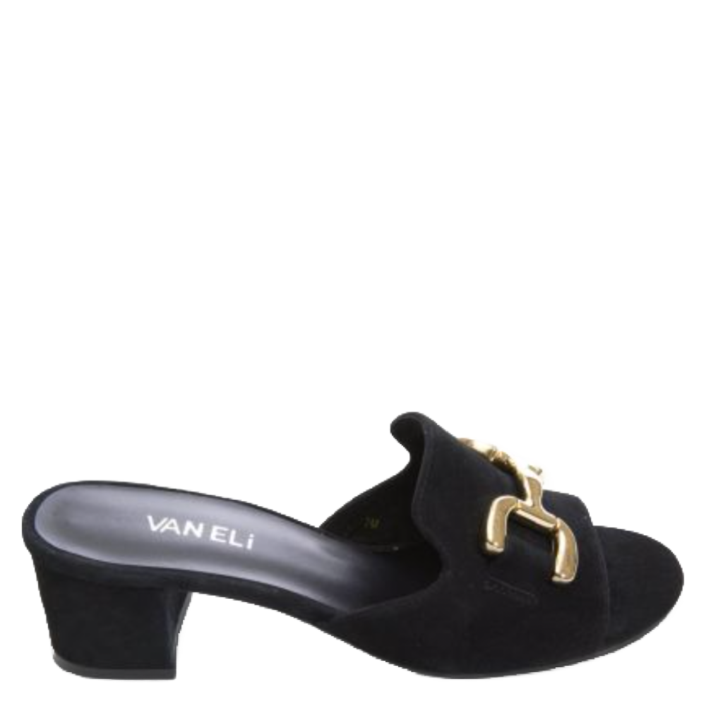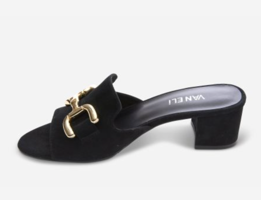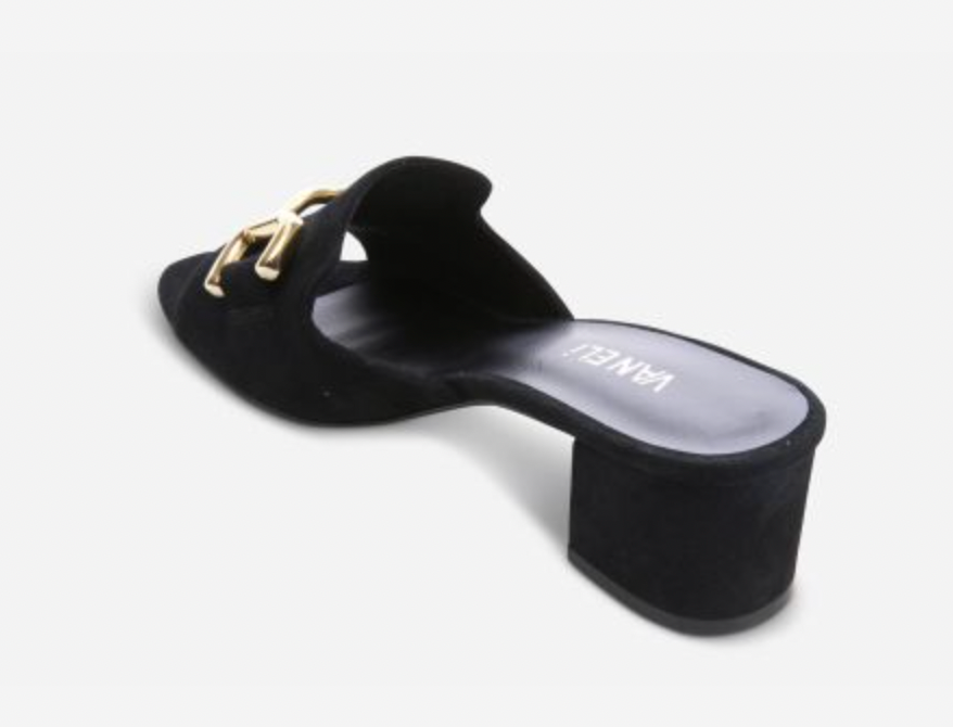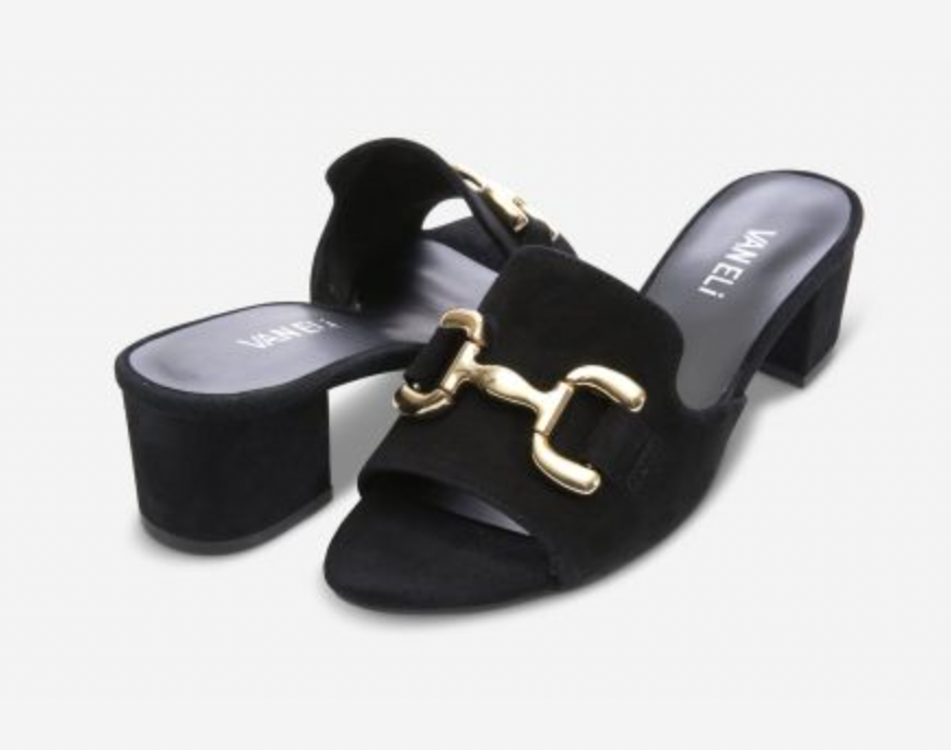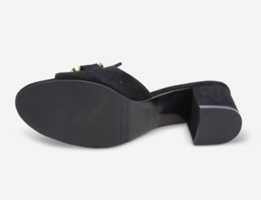 Loafer-inspired heeled sandal. Oversized metal bit. Padded insole. 1.75 inch covered heel.