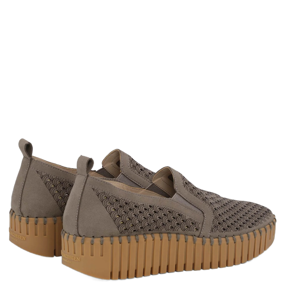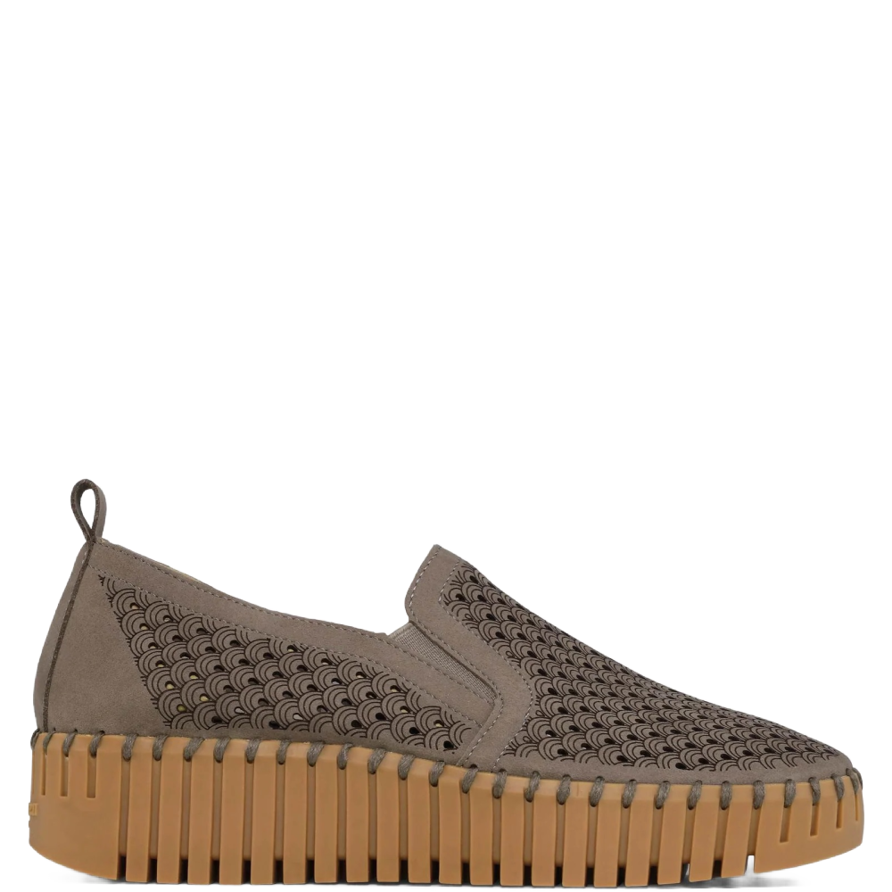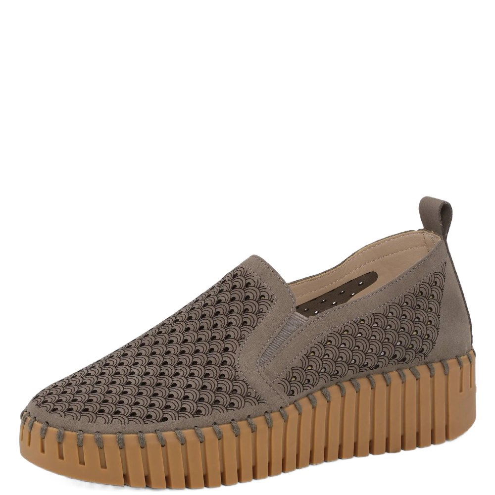 Tulip slip-on shoe on a wedge sole. The upper is made of recycled microfiber with elastics on the sides. The outsole is stitched with matching recycled thread, entirely glue-free. Inside, the soft insole provides great comfort through added padding and support.
