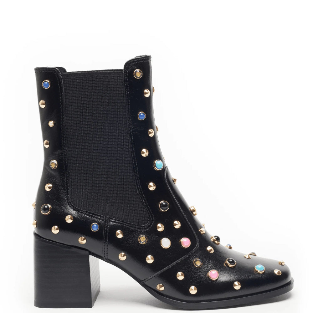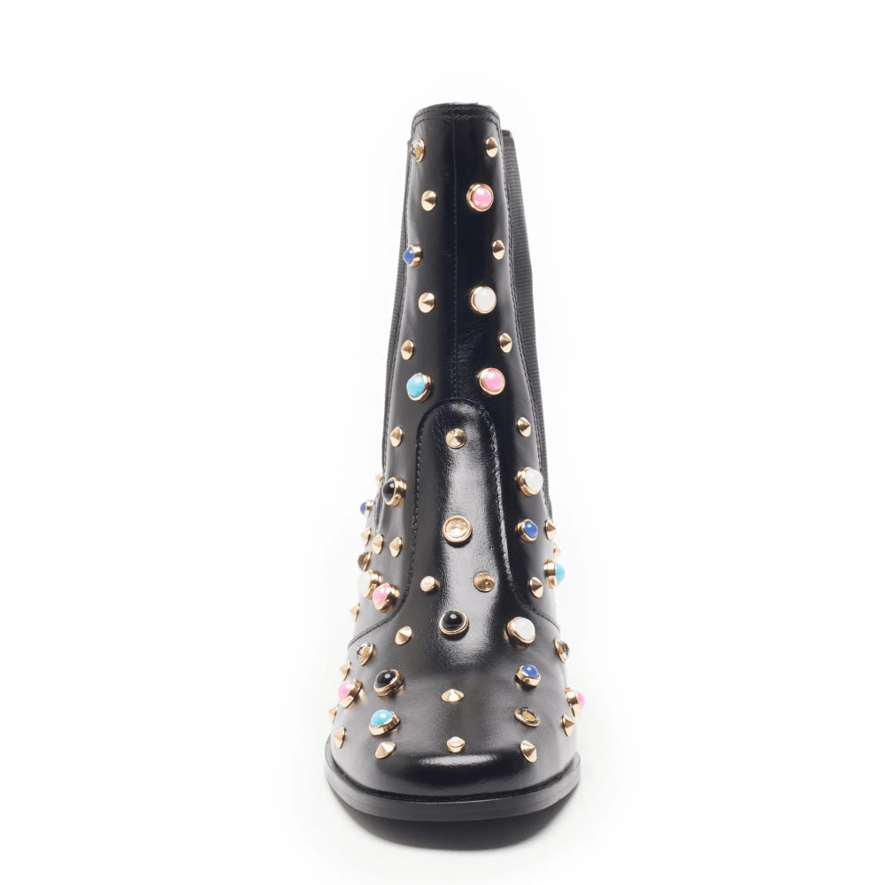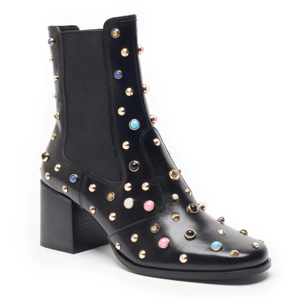 Colorful beads bring undeniable glamour to this bootie featuring a stacked block heel, round toe and elastic gore inset for easy on, easy off wear.