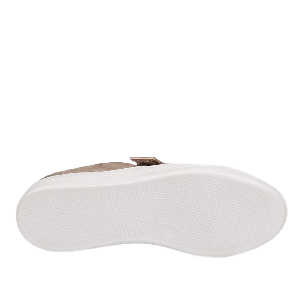 Suede fashion sneaker. Oversized rhinestone buckle. Hook and loop vamp strap. Ultra-padded removable insole. 1 inch rubber sole.