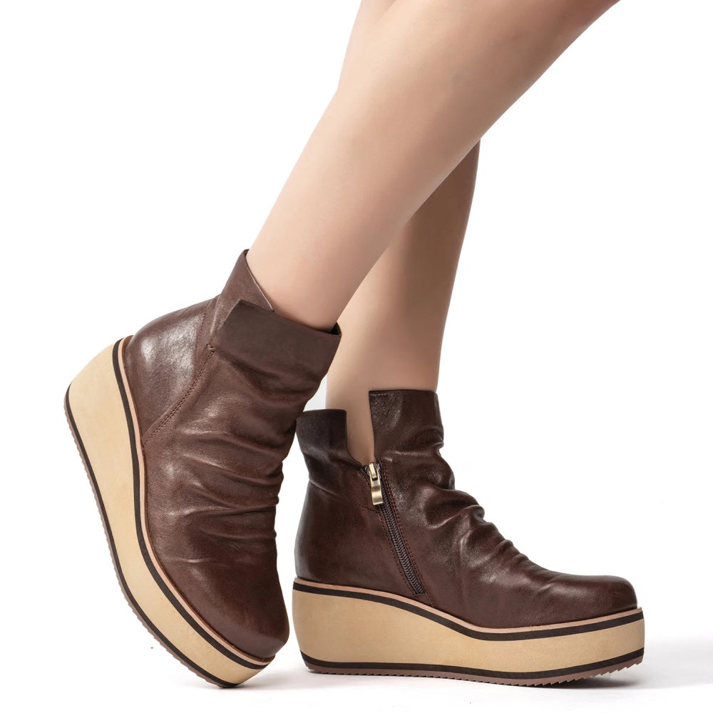 Make a statement with these wedge platform ankle boots ruched leather, featuring distinctive gathered leather detailing that adds sophisticated texture to any outfit. The hand-finished ruched leather upper creates beautiful visual interest while the wedge platform sole provides comfortable elevation perfect for all-day wear. These stylish ankle boots combine a latex-cushioned insole with a stable platform design, delivering exceptional support whether you're navigating city streets or attending evening events. The easy side zipper closure ensures convenient access while maintaining the sleek silhouette. Perfect for fashion-forward individuals seeking the ideal balance between dramatic height and walking comfort.