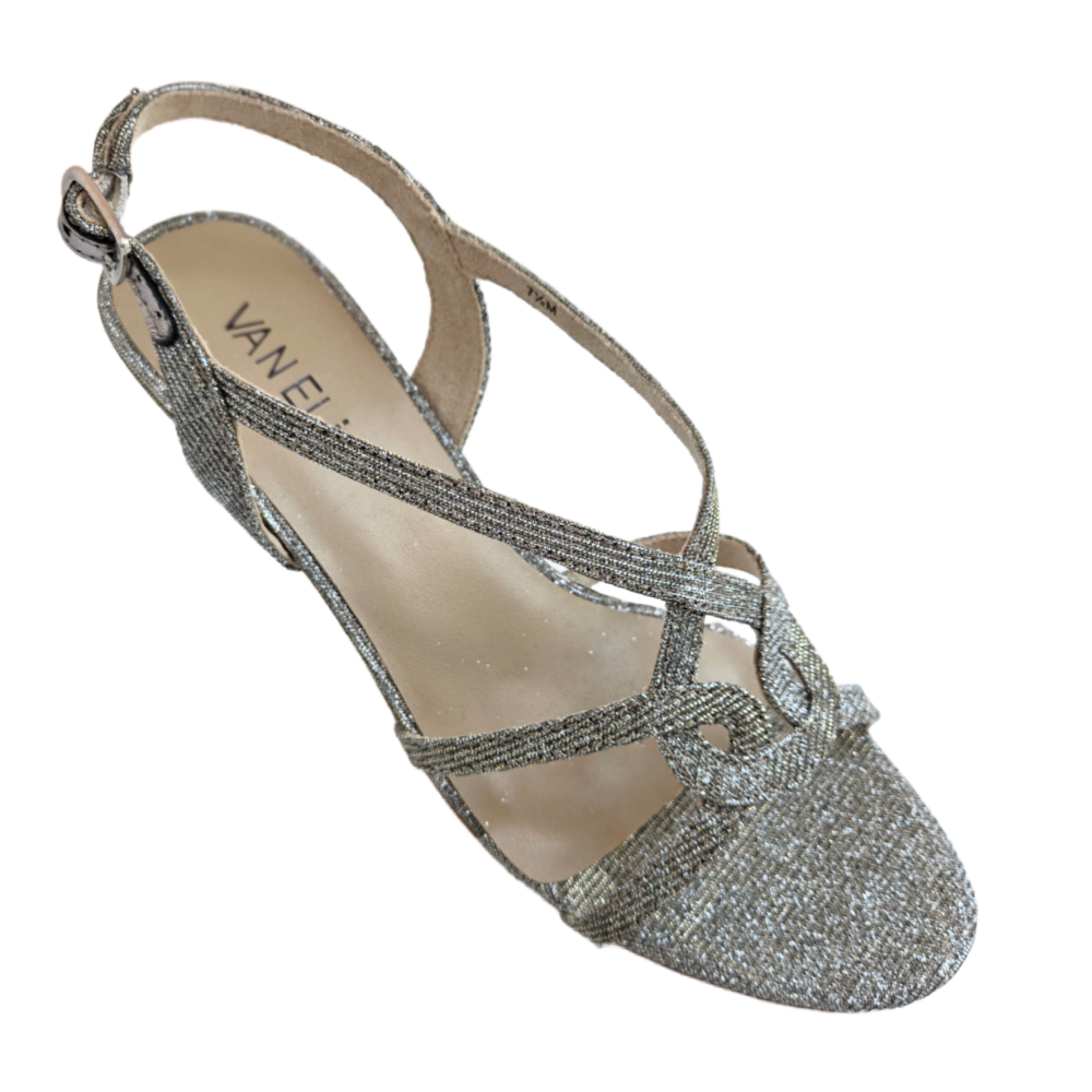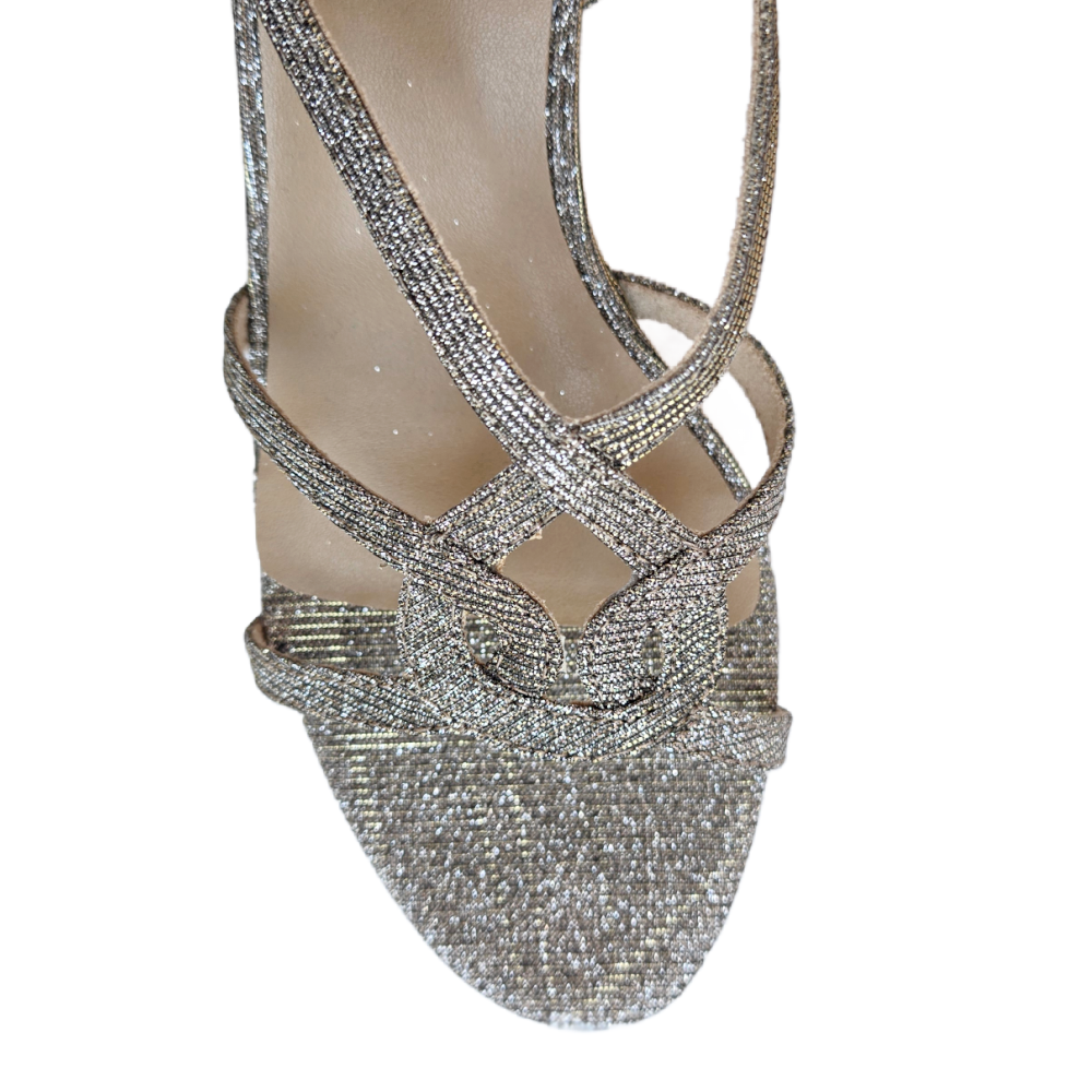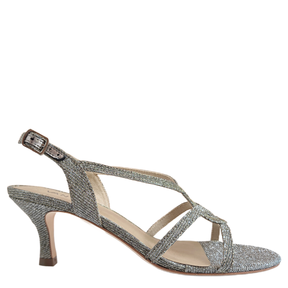 Dressy high-heel sandal. Adjustable buckle with hidden elastic insert. Padded insole. 2.5 inch covered heel. Platinum Nizza Fabric.