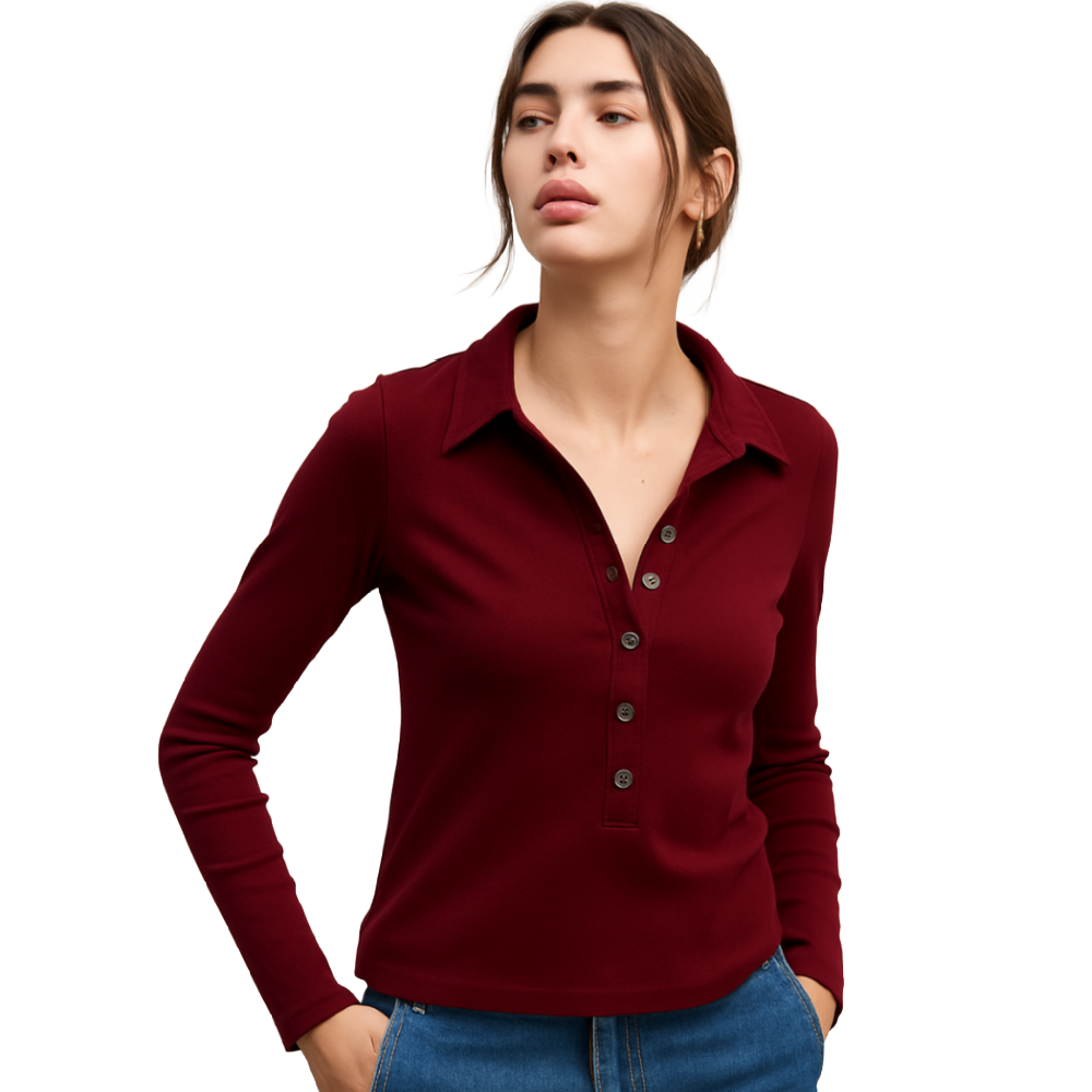 A sleek and versatile burgundy top with a soft stretch fit, button-up neckline, and pointed collar. Perfect for layering or styling solo, this piece transitions effortlessly from work to weekend. Finished with subtle cuff detailing for a refined touch.