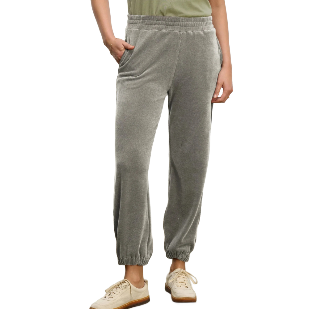 This jogger is crafted from soft cotton velour for a luxurious feel. It has a comfortable elastic pull-on waist and cuffed hems, making it an easy and elevated choice for everyday wear.