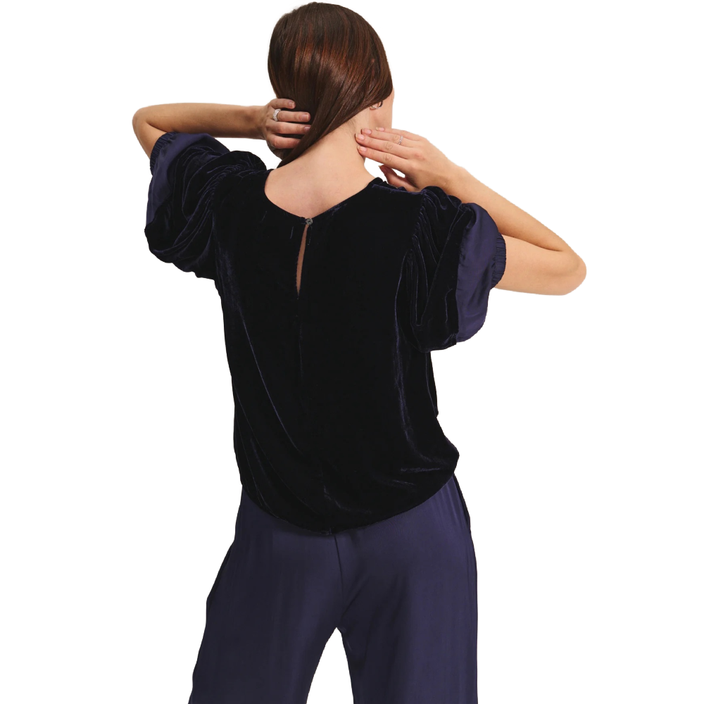 Designed in luxurious silk velvet with satin detailing on the arms, this top exudes elegant sophistication. Featuring puff sleeves, elastic cuffs, a single keyhole closure at the back, and a loose fit, it offers textured dimension and effortless style for elevated occasions.