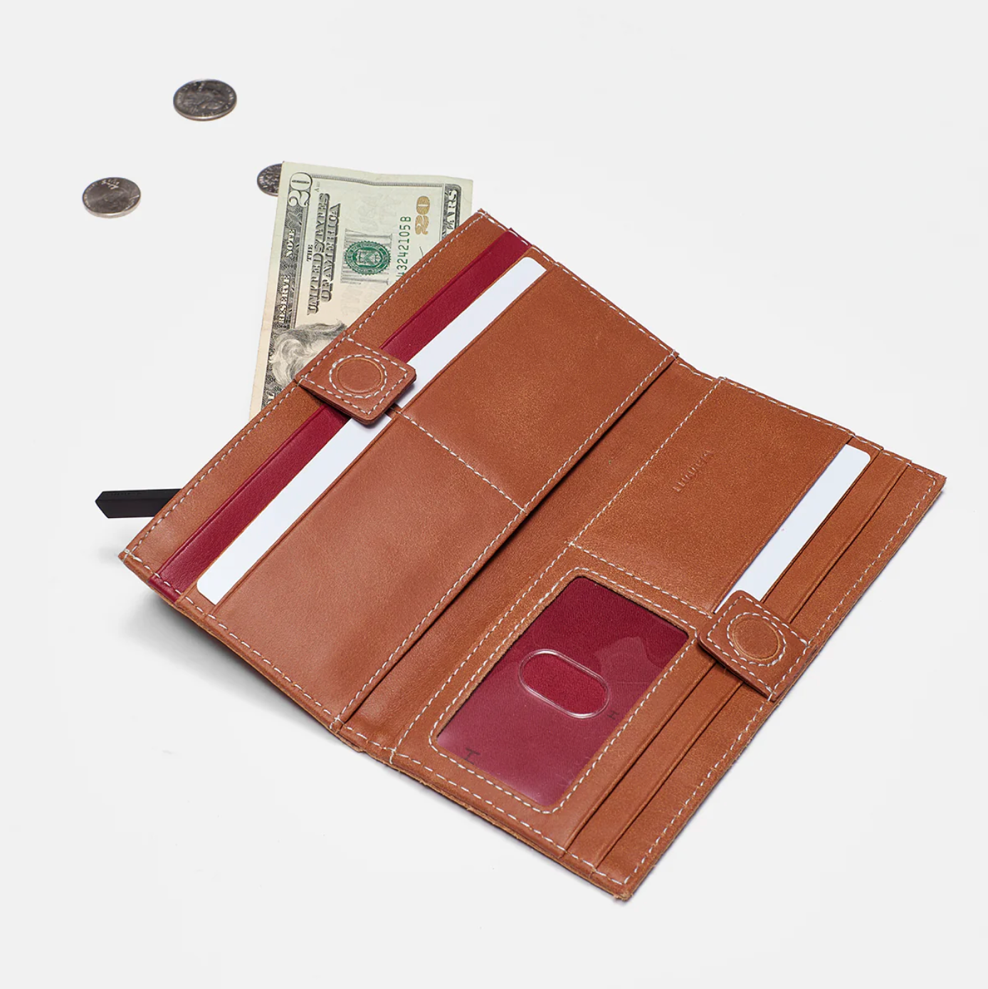 - Interior: Two drop pockets, ten credit card slots, one clear ID slot