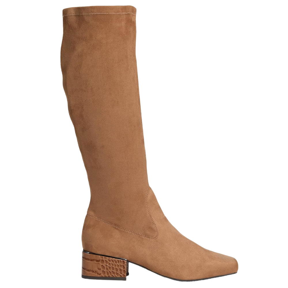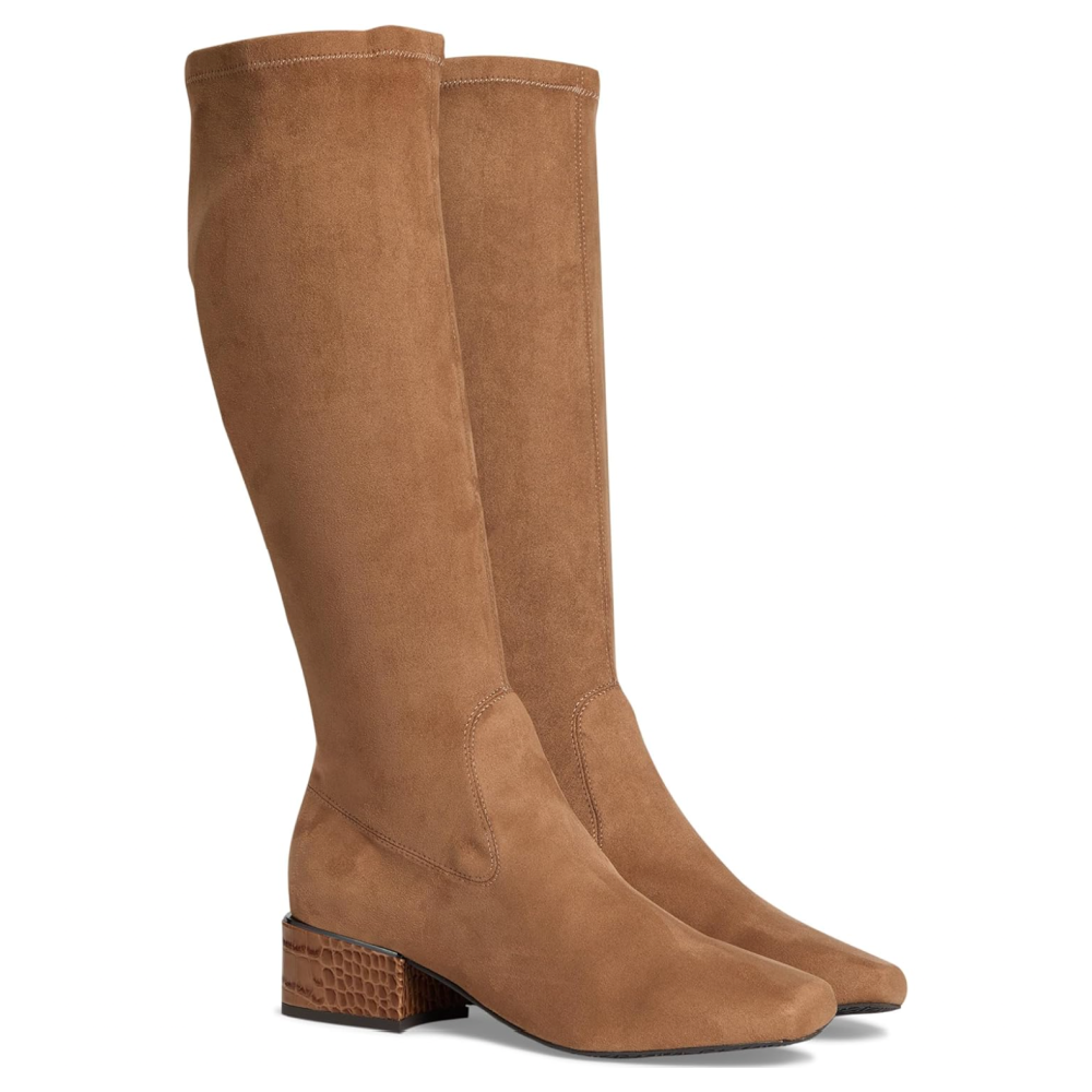Crafted from a smooth, stretch-suede material, these boots offer a sleek, streamlined silhouette that pairs perfectly with any outfit. The standout feature? A low block heel with a chic snakeskin texture adds a subtle yet eye-catching contrast.