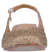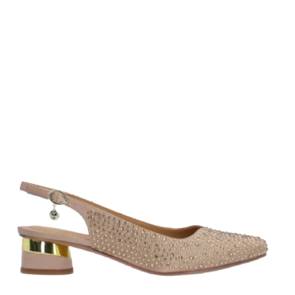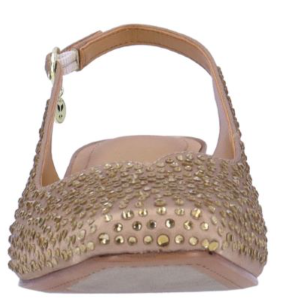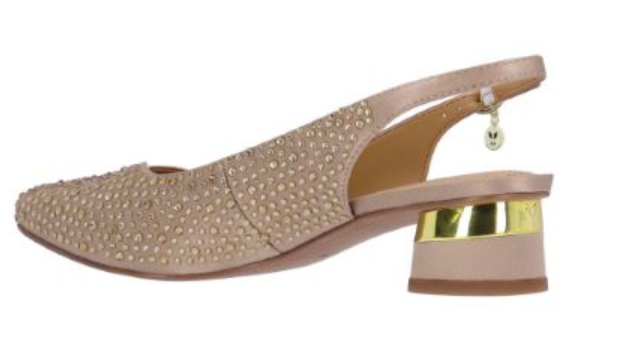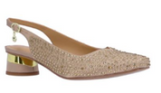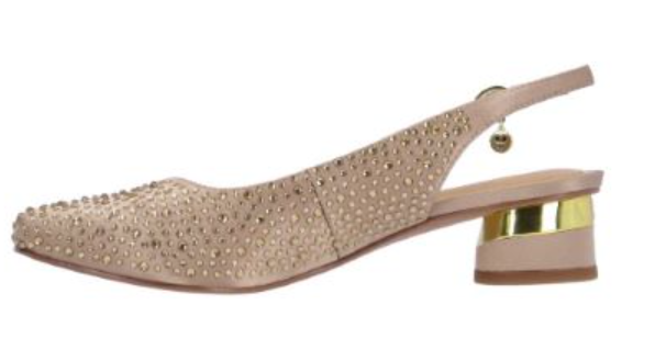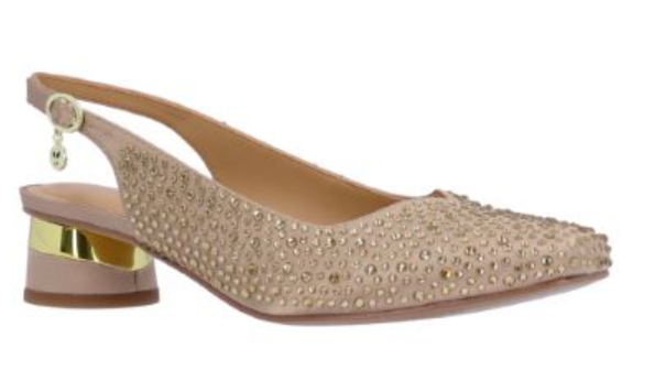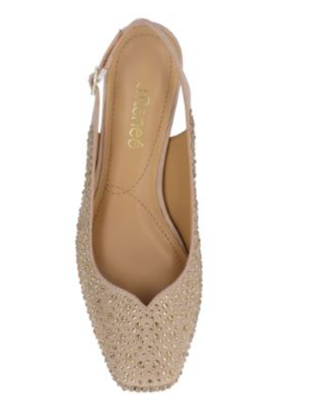 This fabric/rhinestones pump has a square toe, memory foam+latex insole, synthetic lining and synthetic outsole. This style also features a buckle closure on a 1.5 inch heel.
