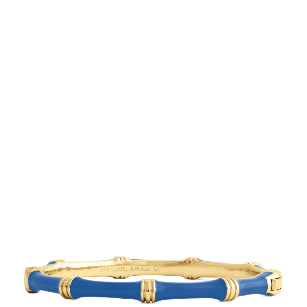 Elevate your everyday looks with the radiant allure of this bamboo hinged bangle, now in 4 new beautiful hand painted enamel colors. Crafted from sumptuous 18k gold-dipped brass, the bangle is sculpted to perfection, adorned with sparkling crystals that catch the light with every movement. Its secure hidden clasp, reminiscent of the finest jewelry craftsmanship, ensures both elegance and ease of wear, making it a refined accessory for any occasion. In the realm of accessories, this bamboo hinged bangle stands out as an exceptional piece of artistry. The intricacy of the sculpted design and the shimmering crystals culminate in a perfect union of glamour and versatility. The hidden clasp adds an element of mystery and refinement, making this bangle a stunning addition to your collection. Whether paired with casual or formal attire, it promises to be the perfect touch of sophistication, adding a radiant sparkle to your daily ensembles.