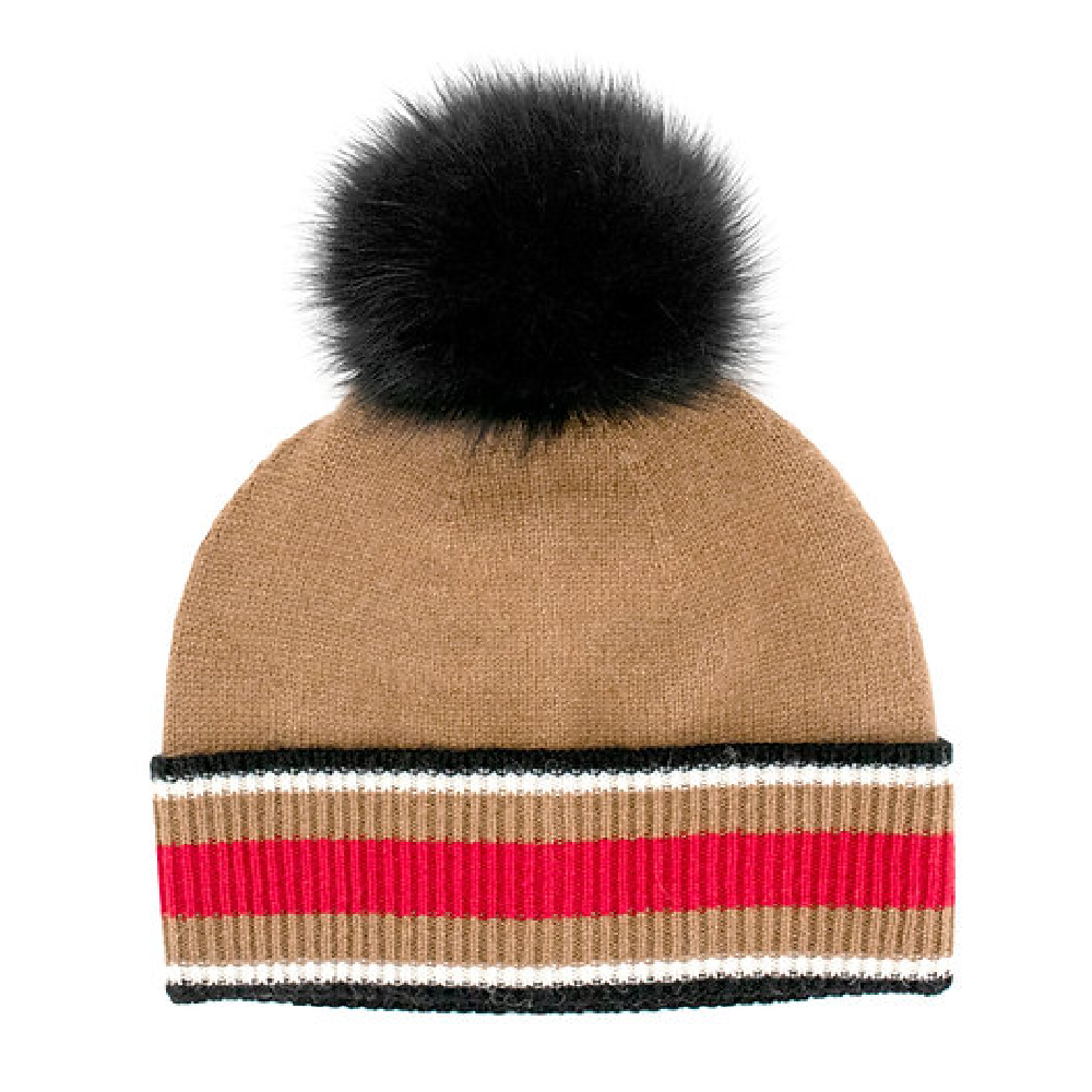 A Camel Knit Hat designed with a bold twist—a contrasting cuff that adds a pop of color and character to your winter wardrobe. This striking combination creates a unique and eye-catching look with an ethically sourced fox fur pom pom.