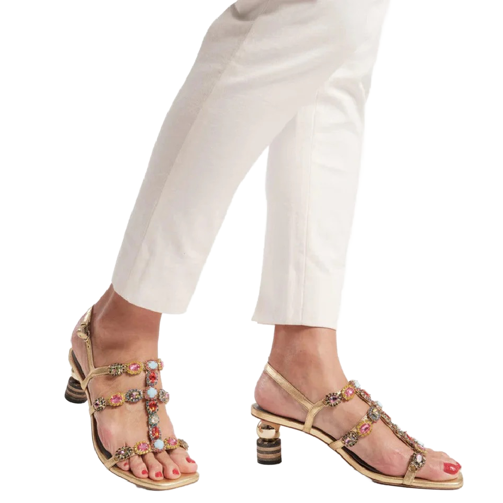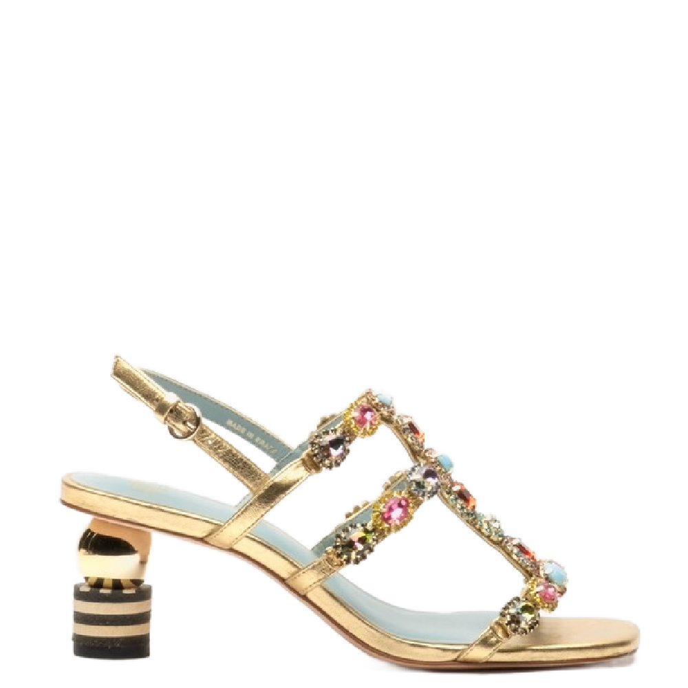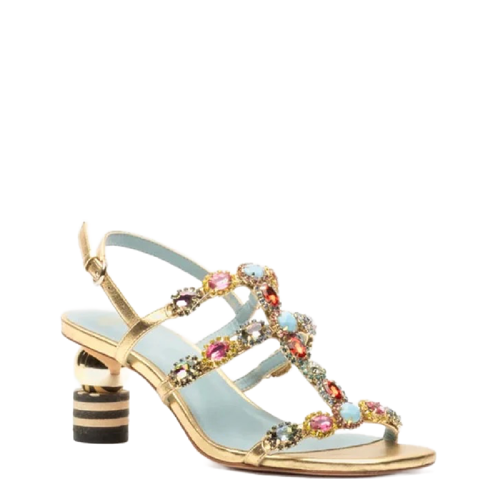 A twinkling halo encircles each glittering rhinestone on this glamorous sandal set atop a cylindrical heel with a luminous goldtone orb.