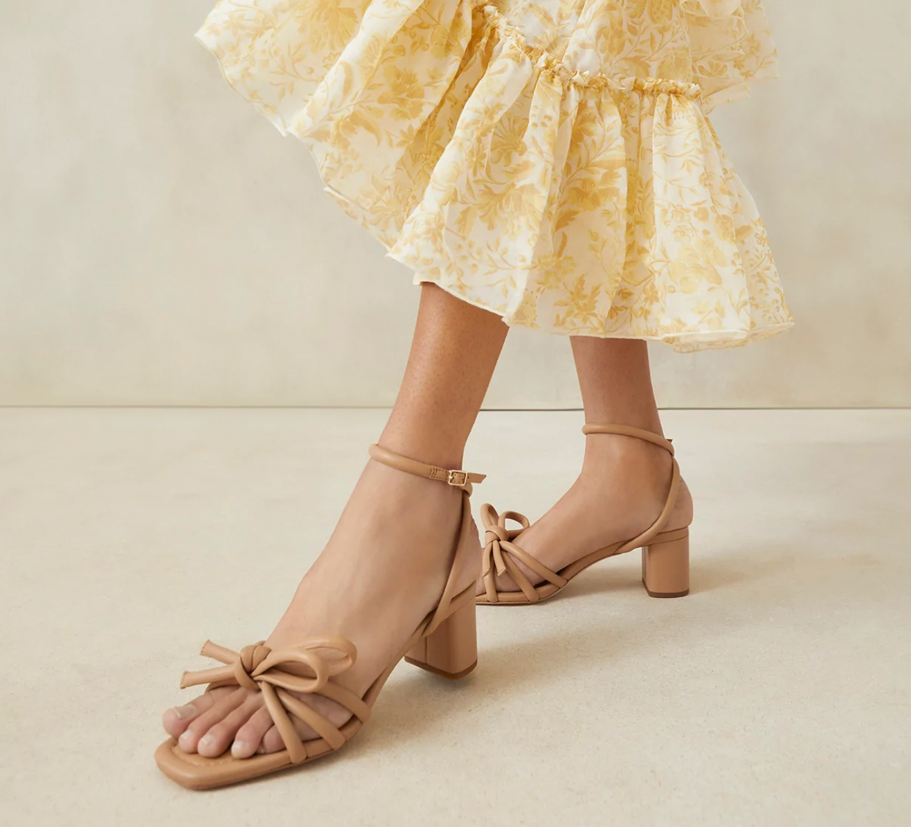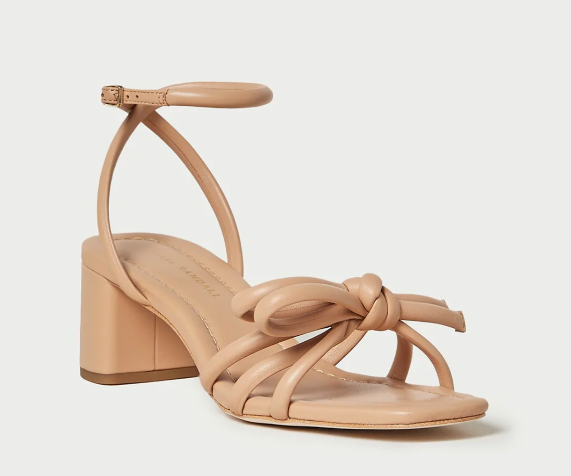Mid heel sandal with knotted bow detail in beige nappa leather. Features a padded footbed with gold stamped logo and an open, squared toe.