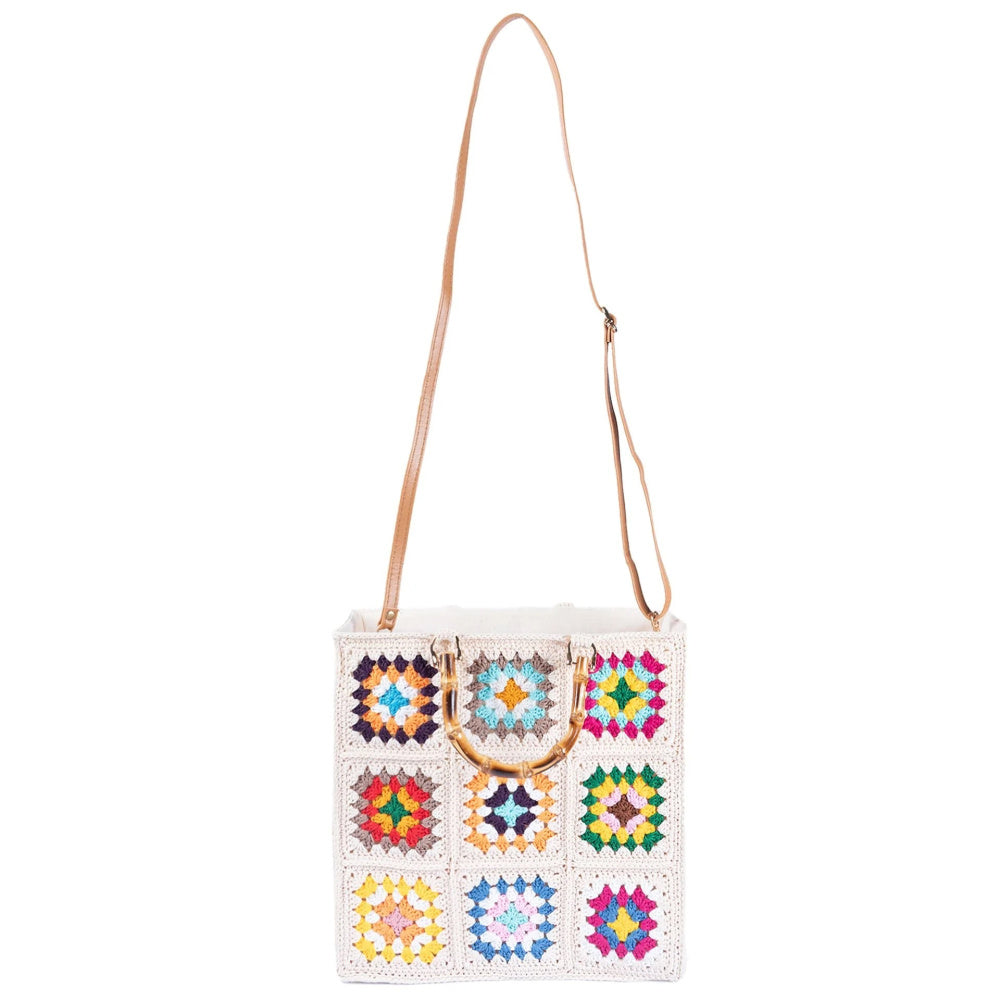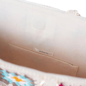 The Jelavu Mathilde bag is crafted in raffia with rattan and features embroidered graphics with raised details. This bag can be styled as a crossbody.